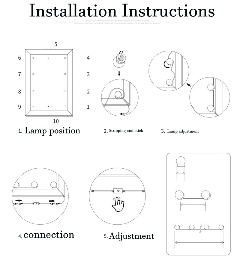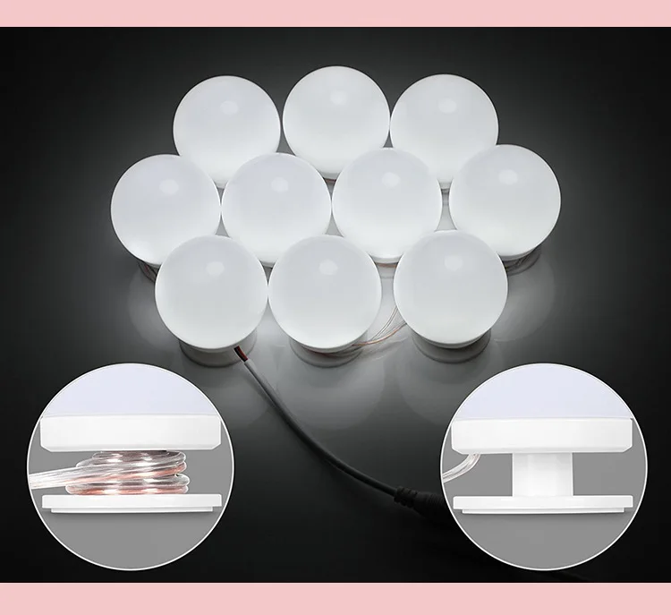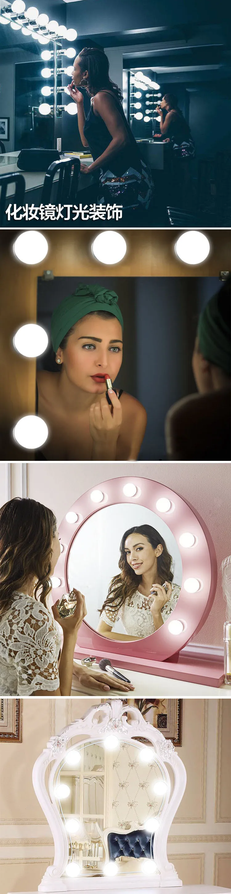 Советы: зеркальные лампочки для макияжа поддерживают несколько режимов питания, но в их комплект не входят батарейки. Преимущества: * Светодиодные зеркальные лампочки Vanity в голливудском стиле, новейший дизайн, усовершенствованная версия, более красивая и удобная. * Usb-порт, лампы и источник питания могут быть подключены через USB многими способами, такими как ноутбук, блок питания, розетка, поэтому это очень удобно при использовании. * Регулировка яркости, яркость может регулироваться от яркого до темного, от темного до яркого, в соответствии с вашими потребностями. * Он оснащен функцией памяти, записывает последний режим освещения, когда вы используете его, и это тот же режим освещения, когда вы используете его снова. * Максимальное расстояние между двумя лампами составляет около 33 см, что делает его подходящим для большинства зеркал. * Регулировка длины провода, наименьшее расстояние между двумя лампами может быть уменьшено до 1,7 см, если вы считаете, что он слишком закрытый, он может быть удлинен, в соответствии с вашими потребностями, очень прост в эксплуатации. * Самое главное, чтобы лишние провода были скрыты в лампочках, которые не видны снаружи, чтобы ваше зеркало было аккуратным, красивым и элегантным. * Предусмотрены двухсторонние ленты и присоски, лампочки могут быть непосредственно и быстро наклеены на зеркала с лентами или присосками. * 12 В постоянного тока входное напряжение, безопасно для использования. * Хороший охлаждающий эффект, энергосбережение, длительный срок службы. * Мягкий свет, высокая светоотдача, отсутствие теплового излучения, отсутствие мерцания, отсутствие пятен, защита глаз, обеспечение профессионального освещения для макияжа. * Используется для макияжа, заполняющего света, украшения, зеркальной декоративной лампы, лампы для украшения сцены, лампы для украшения шкафа и т. д. * Подходит для свадьбы, дня рождения, Дня Святого Валентина и других праздников. Параметры: * Название продукта: светодиодные лампы * Материал: Поликарбонат * Входное напряжение: DC12V * Мощность: 8 Вт/12 Вт/16 Вт/20 Вт * Цвет света: натуральный белый * Цветовая температура: (3500-5500 K) * Размер лампы: 3,2 см X 4 см X 4,8 см * Количество ламп: 2 шт./6 шт./10 шт./14 шт. * Расстояние между 2 лампами: около 33 см * Диммируемая: Плавная диммируемая