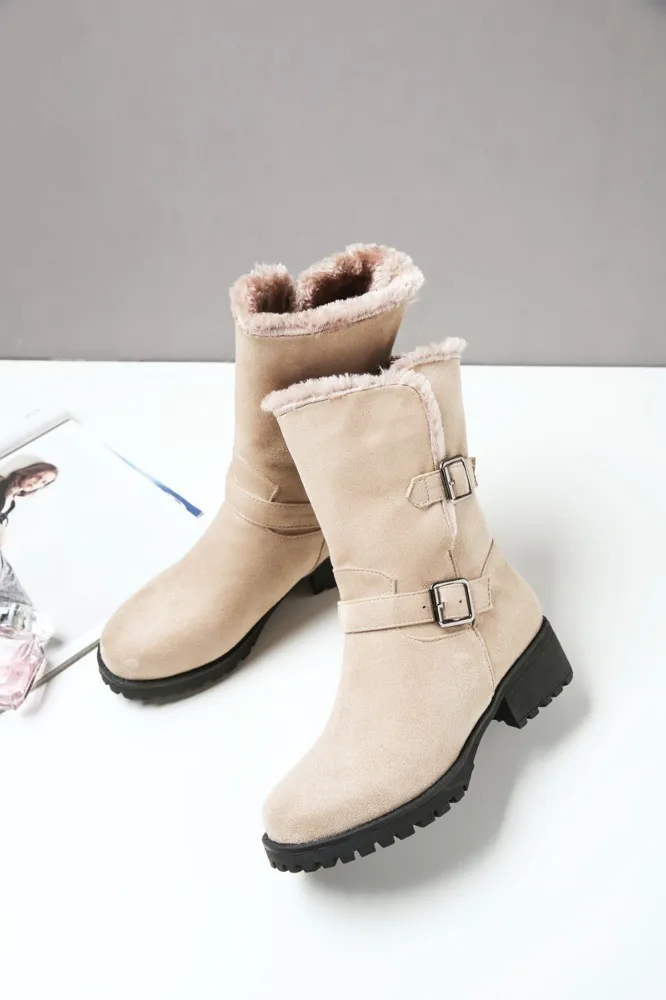 Зимние сапоги на среднем каблуке с пряжкой; зимняя женская модная обувь на низком квадратном каблуке; элегантные женские Теплые ботильоны; Цвет черный, бежевый, коричневый; D080