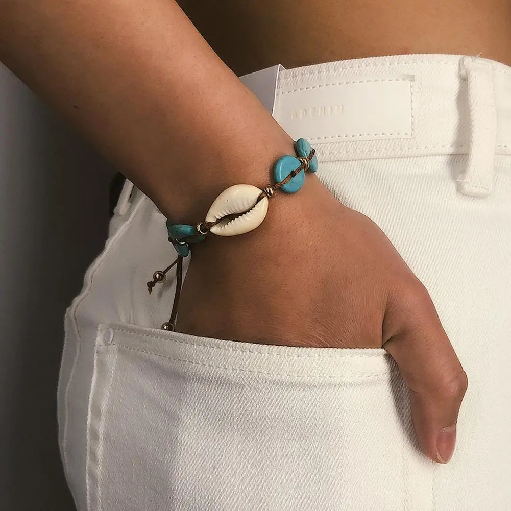 Богемные женские раковина Каури круглые бирюзовые бусины Шарм Плетеный браслет ручной работы браслет