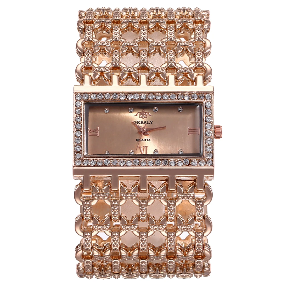 Features: Roman Numerals Display, Rhinestone Inlaid, Square Dial, Hollow Wide Band