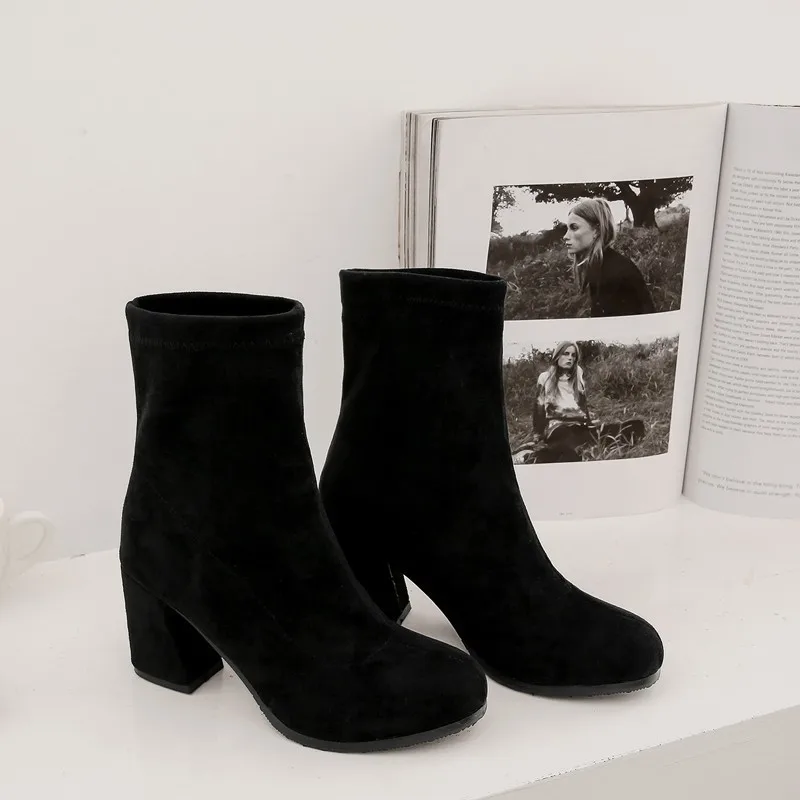 Ботильоны на высоком каблуке; Женская Осенняя модная обувь на квадратном каблуке; Элегантные женские полусапожки с круглым носком; Цвет черный, бежевый, желтый, серый; E109