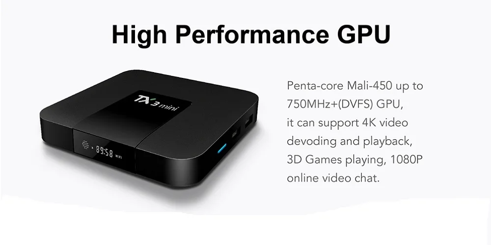 Основные характеристики: -Четырехъядерный Amlogic S905W ARM Cortex-A53 -Графический процессор: Mali-450 пятиядерный, до 750 МГц +(DVFS) -Оперативная память: DDR3 1 ГБ/2 ГБ, ROM: eMMC Flash 8 ГБ/16 ГБ -ОС Android 8,1 -Поддержка H.265, 4K 30pfs, HD 2,0; -IEEE 802.11b/G/n, 10/100 Мбит/с LAN, 2,4G Wifi; Что в коробке? -Мини-бокс TX3-1 шт. -1 пульт дистанционного управления -1 блок питания -1 кабель HD -1 Руководство пользователя