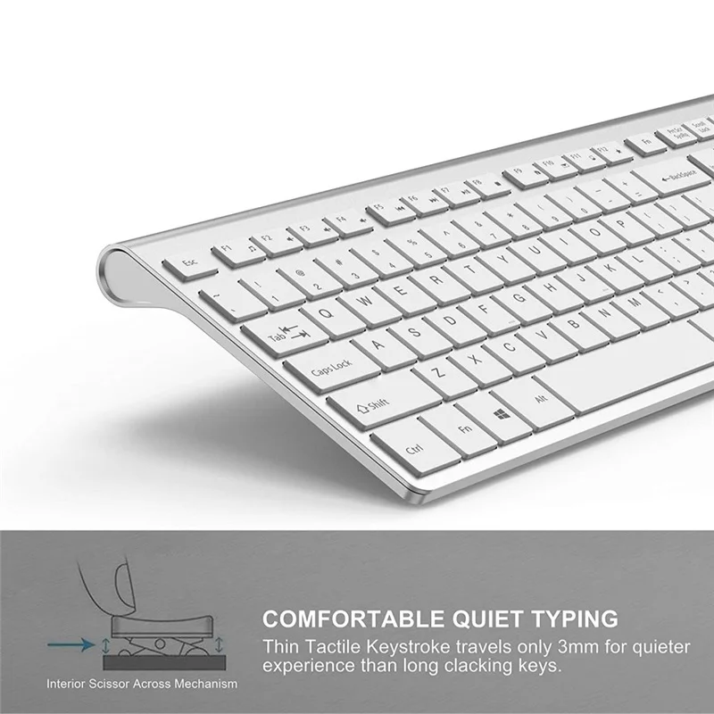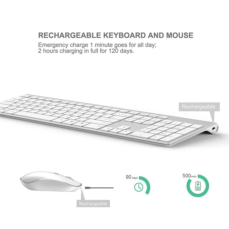 ● Перезаряжаемые вторичные батареи-нет необходимости заменять или утилизировать щелочные батареи больше! Как беспроводная клавиатура, так и мышь встроены литий-ионные аккумуляторы емкостью 500 мА · ч; Одна полная зарядка обеспечивает более 120 часов работы. И клавиатура и мышь автоматически попадут в режим интеллектуального сна, если не будут работать в течение 20 с; Что обеспечивает высокую энергоэффективность и длительный срок службы батареи. ● Стабильное беспроводное соединение 2,4 ГГц-комбо с беспроводной клавиатурой адаптирован с улучшенным чипсетом 2,4G для бесконтактного соединения. Вы будете наслаждаться высокой эффективной гладкой работой без запутывания проводов. И один маленький нано-приемник унифицирован для клавиатуры и мыши; Сохраните usb-порты. ● Менее шумный и эргономичный дизайн-Беспроводная клавиатура: ножничный поперечный механизм обеспечивает удобство ввода текста, светильник реагирует и поднимает углы поддерживают вашу руку в течение длительного времени работы. Тихая мышь имеет мягкий щелчок, поэтому нет «щелчка» беспокоить ваше окружение больше! ● Гладкий Компактный стиль-колпачки-это тонкий плоский стиль mac для элегантности и экономии рабочего места; Тонкая клавиатура с металической отделкой сверху и форма линии потока делают его модным на вашем рабочем месте. ● Многоуровневая мышь DPI-Беспроводная тонкая мышь имеет 5 уровней регулировки DPI (800/1200/1600/2000/2400); Поэтому мы можем выбрать правильную скорость курсора в зависимости от работы, игры или Телевизор с разным разрешением или мониторы.
