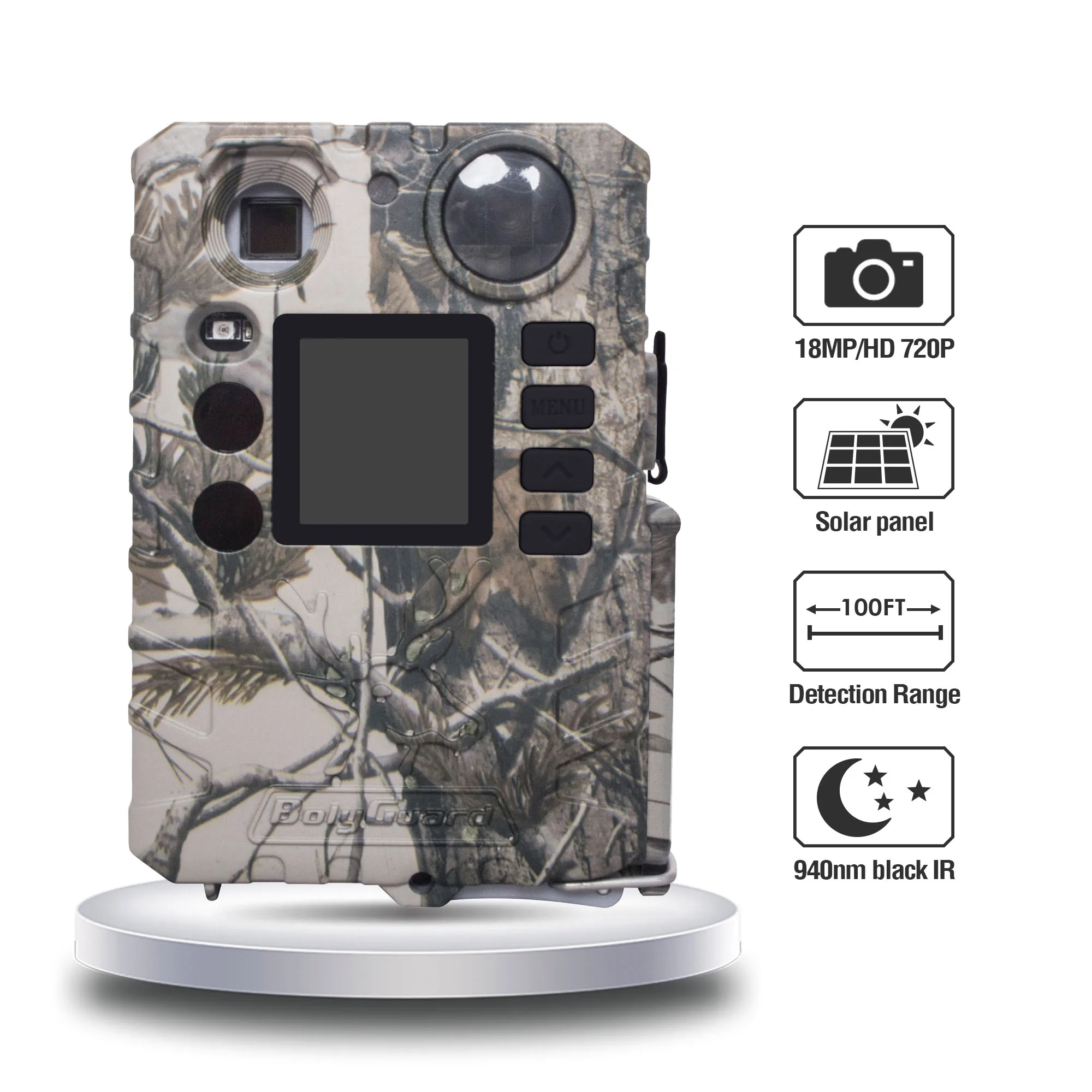 Инфракрасная игровая камера характеристики: 1. Разрешение изображения 18 МП и видео 720p 2. 100 футов. Обнаружение и 70 футов. Диапазон вспышки 3. 57 градусов FOV 4. Быстрое время запуска: менее 0,7 s, триггерный интервал: 0-1 ч 5. 940nm Черный ИК светодиодный свет 6. Поддерживает до 32 Гб TF карты 7. 1,44 "цветной ЖК-дисплей 8. Регулируемый датчик 9. Самая маленькая игровая камера на рынке (107x76x40 мм) 10. Поддержка панели солнечных батарей Boly 11. Использование 2 шт. аккумулятора 18650 с заостренной головкой, длина 67-69 мм