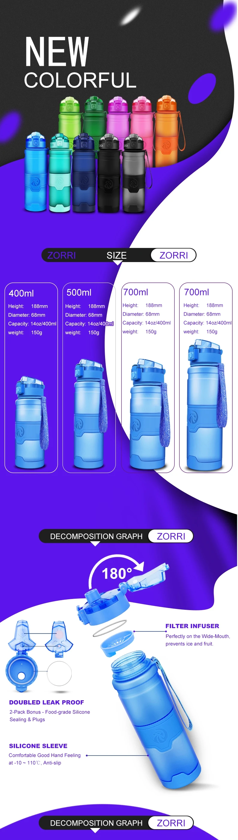Шейкер для Протеиновой воды ZORRI, портативная Спортивная бутылка для воды Bpa Free, пластик для спорта, кемпинга, пешего туризма, 400 мл