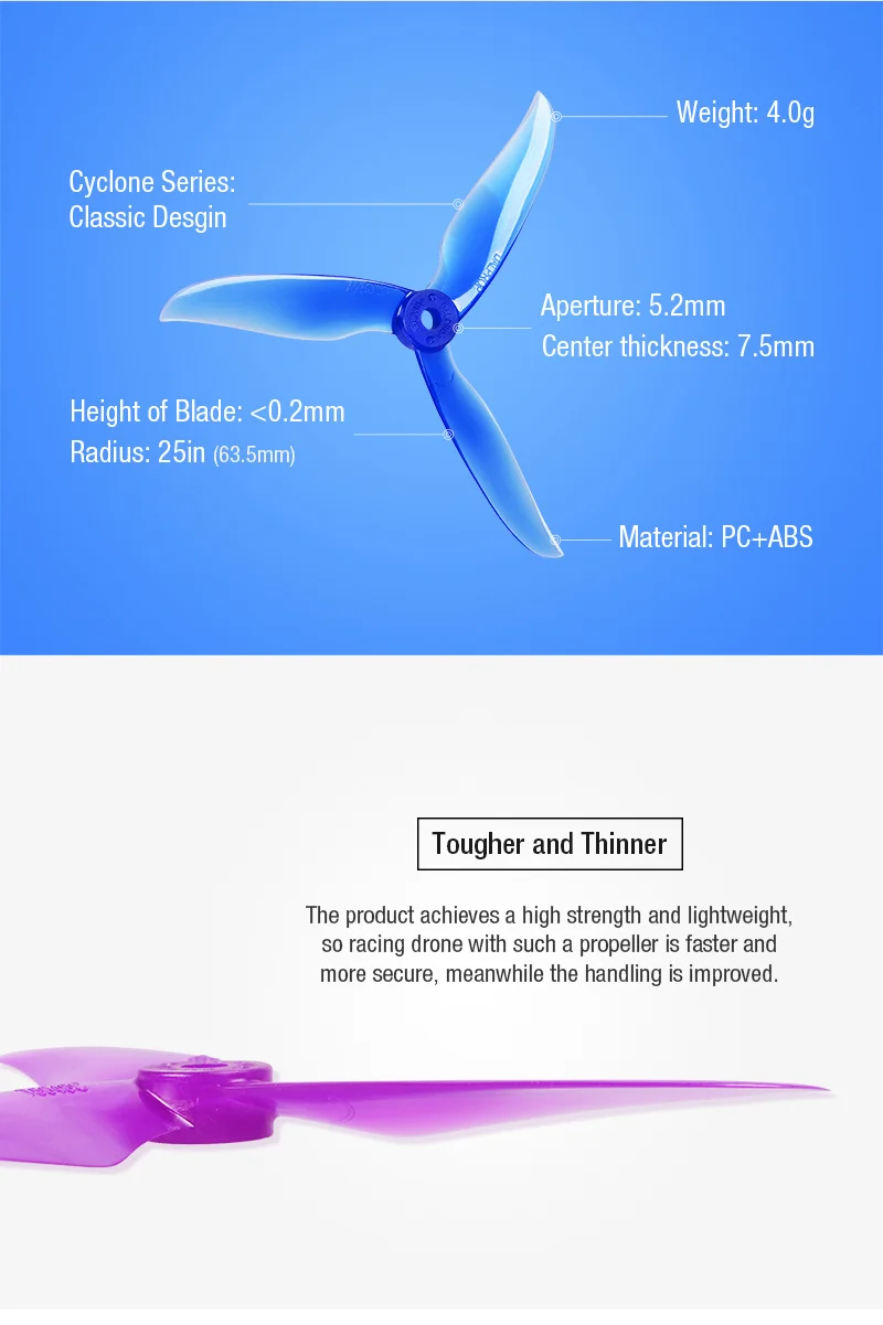 С первого циклона, DAL реквизит были разработаны ведущим профессором аэродинамики в Китае. В течение первых нескольких секунд полета оригинальный Циклон 5045, вы можете почувствовать особую свободу контроля, как дыхание свежего воздуха. Это специальное качество было четко поддерживается на протяжении циклонной линии и еще раз, то же самое вы чувствуете с T5040C.