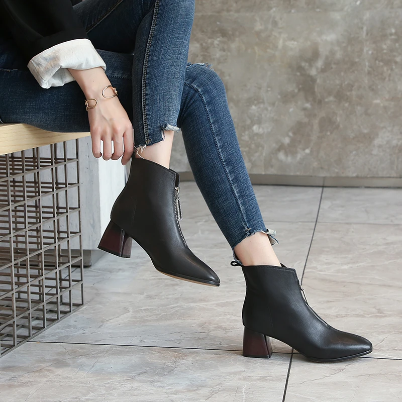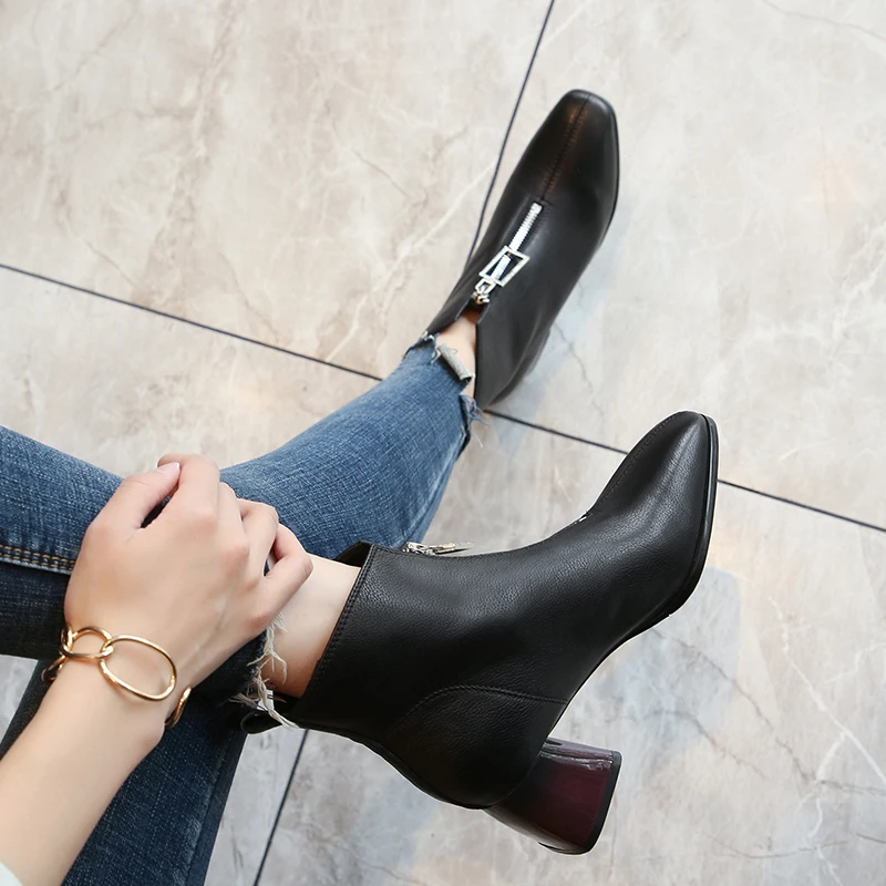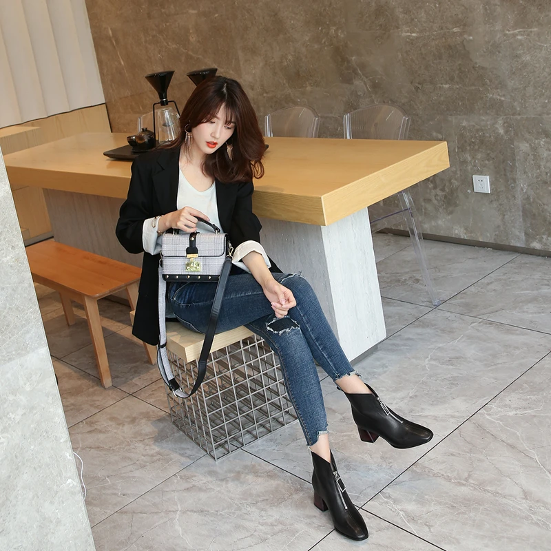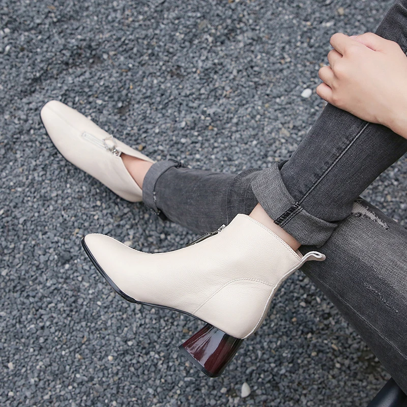 Женские ботинки из коровьей кожи; сезон осень-зима; коллекция 2019 года; женские модные ботинки на квадратном каблуке с металлическим украшением; цвет черный, бежевый; ботинки на молнии с квадратным носком; E161