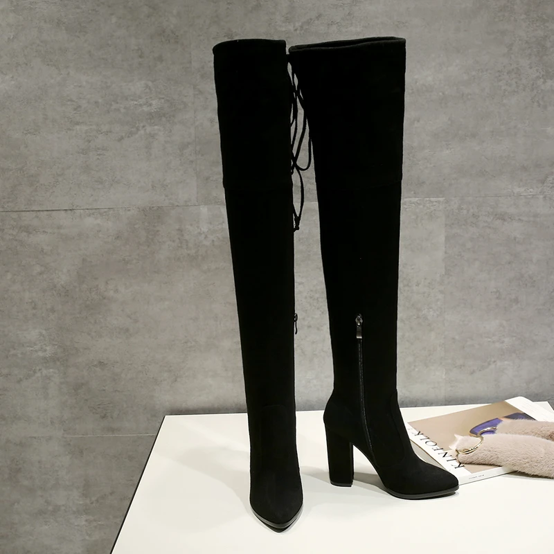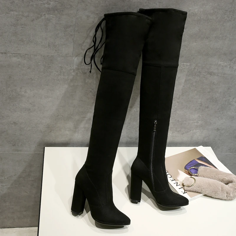 Высокие Сапоги выше колена; Новинка; острый носок; эластичная ткань; квадратный каблук; узкий ремешок; Женская Осенняя обувь; E164; женская зимняя обувь черного цвета