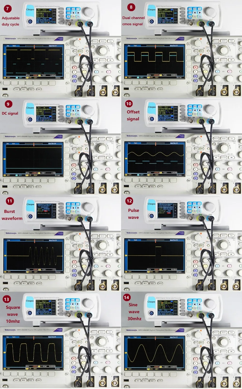 Синус, квадрат, треугольник, пульс (коррекция рабочего цикла, ширина импульса и время цикла регулируются), произвольная волна, CMOS, уровень постоянного тока, полуволна, полная волна, pos-ladder, neg-Ladder, noise, exponential rise, exponential fall, tone, cink pulse, lorentz pulse и 60 видов пользовательских форм сигналов.