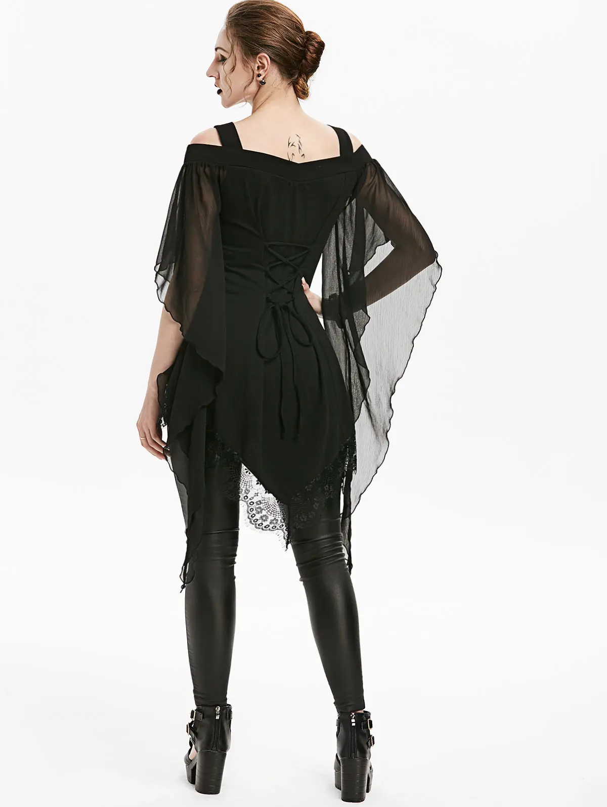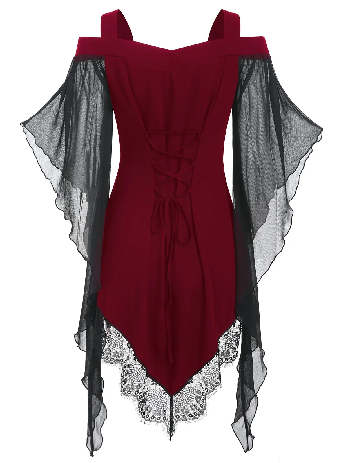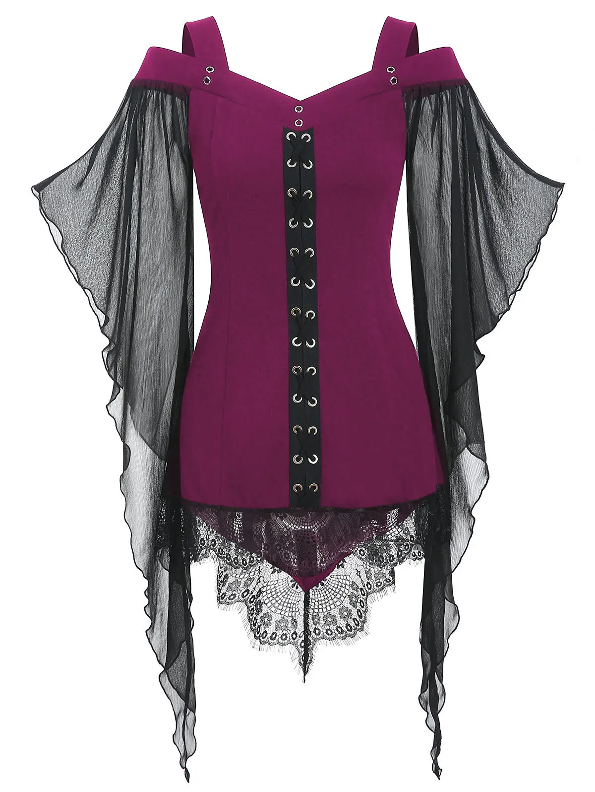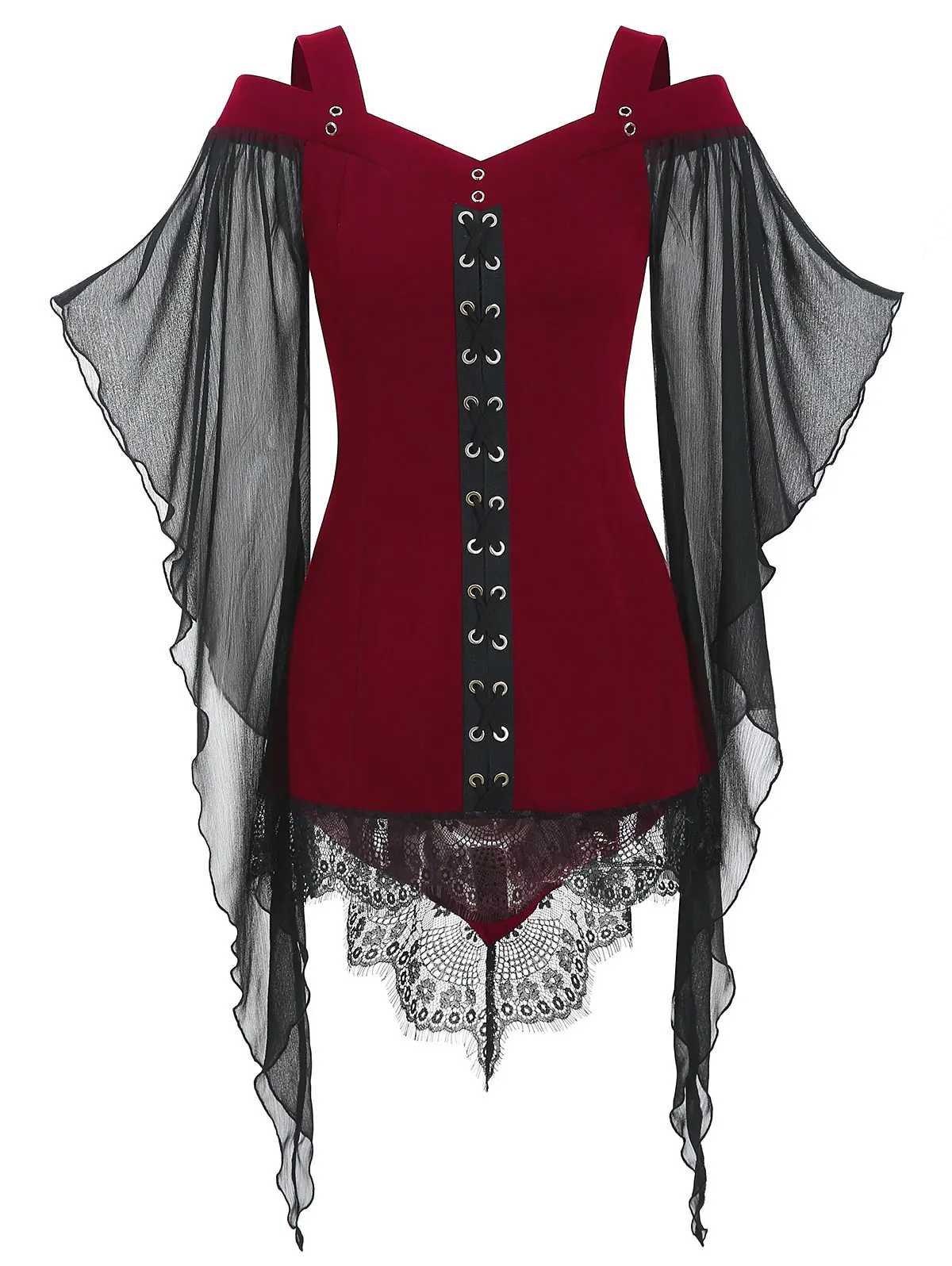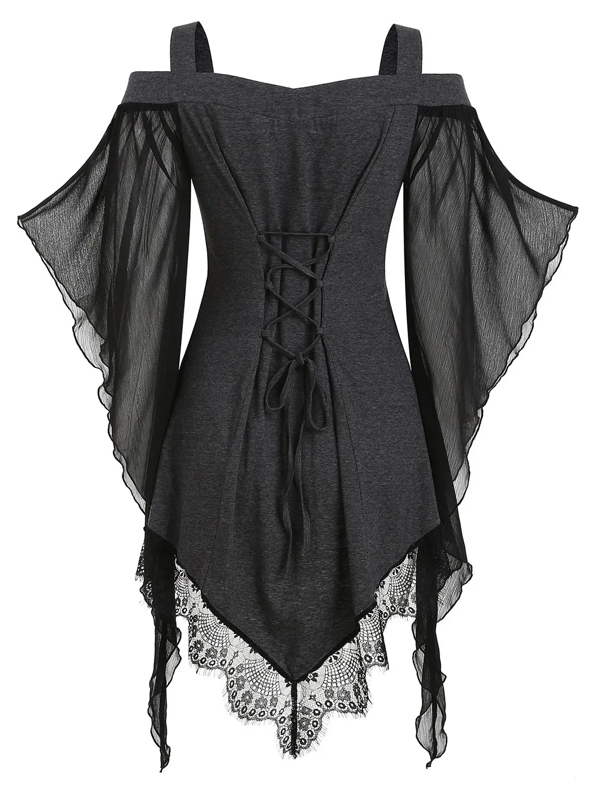 Лето Осень Готическая Футболка крест-накрест кружевная панель холодное плечо футболка длинная рубашка три четверти Милая Шея ретро сексуальный топ