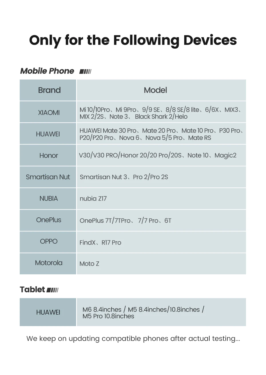 HUAWEI Mate 30 Pro, Mate 20 Pro, Mate 10 Pro, P30 Pro, P20/P20 Pro, Nova 6, Nova 5/5 Pro, Mate RS