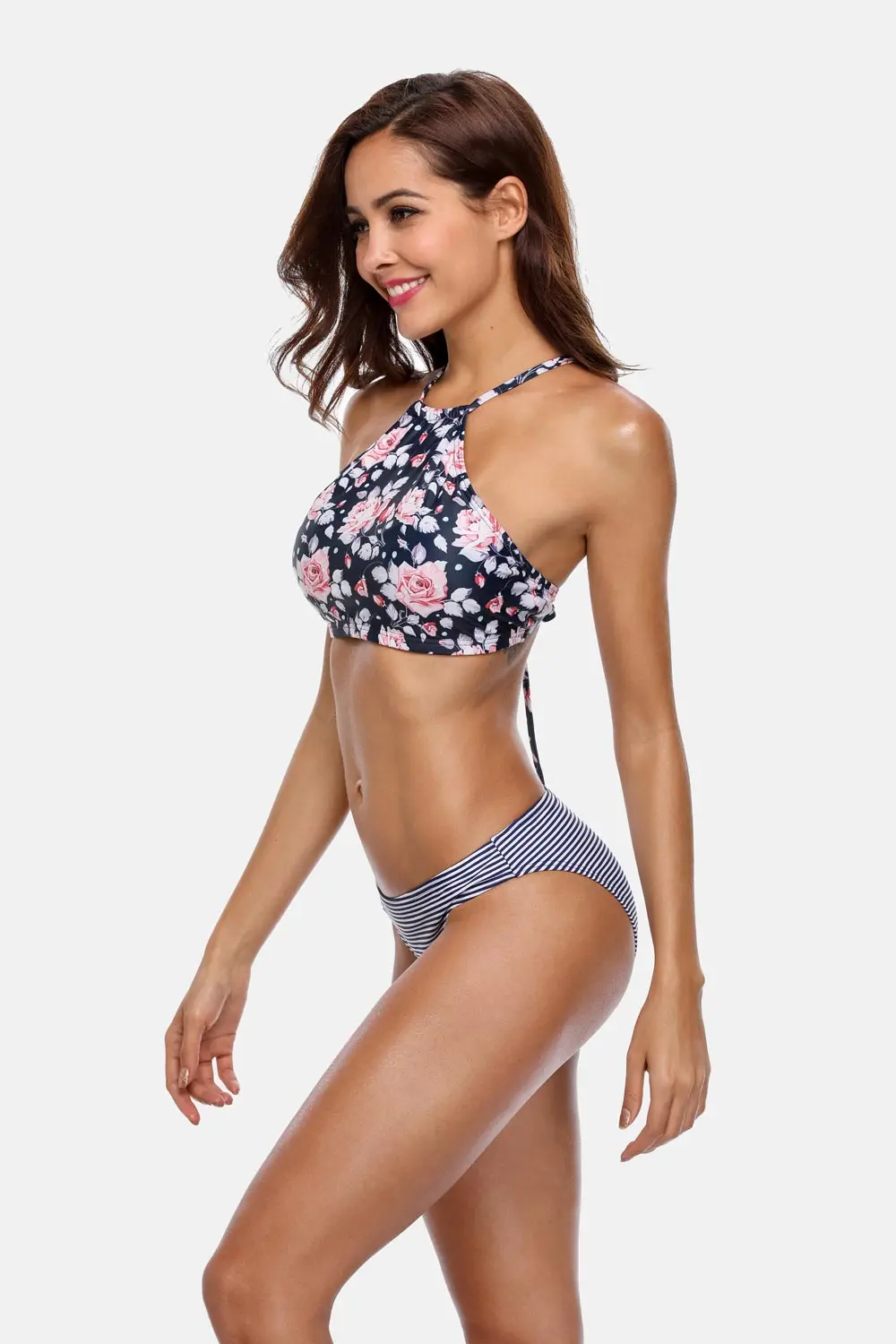 Женский купальник-бикини в полоску Anfilia, винтажный купальник с высокой горловиной и цветочным принтом, купальный костюм на бретелях, пляжная одежда с подкладкой