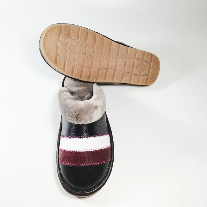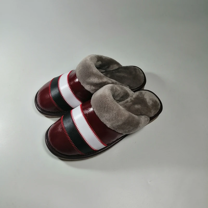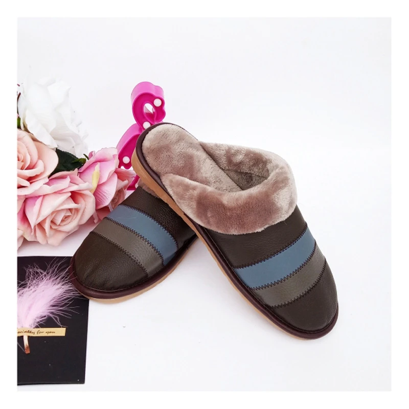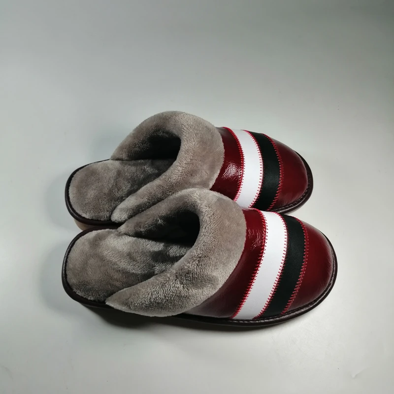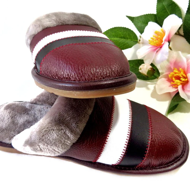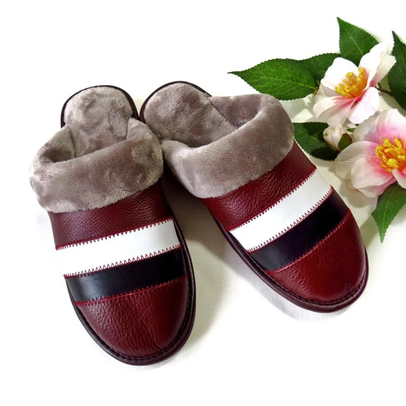Зимние домашние тапочки на подошве, Для женщин натуральная коровья кожа мода женская обувь теплая обувь E178 Повседневное Прошитые женские черное платье с полосками комплект однотонной одежды красного цвета без шнуровки