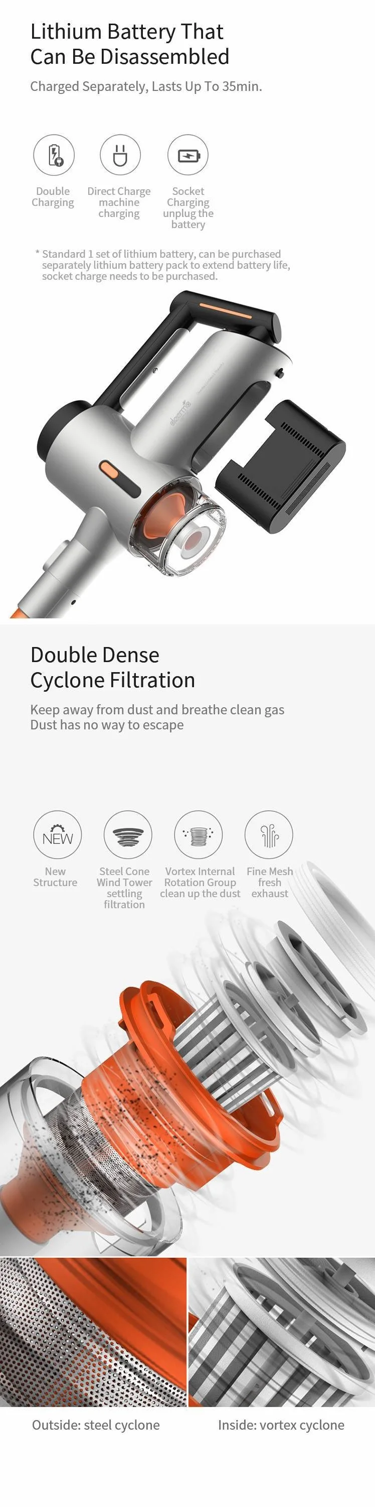 Высококачественные литий-ионные батареи, малый размер, высокая энергия. Улучшите дизайн цепи, чтобы уменьшить потери энергии, легко носить с собой чистоту от первого пола до второго пола, всасывание является прочным, чистым и бесплатным, чтобы сделать все, что вы хотите.