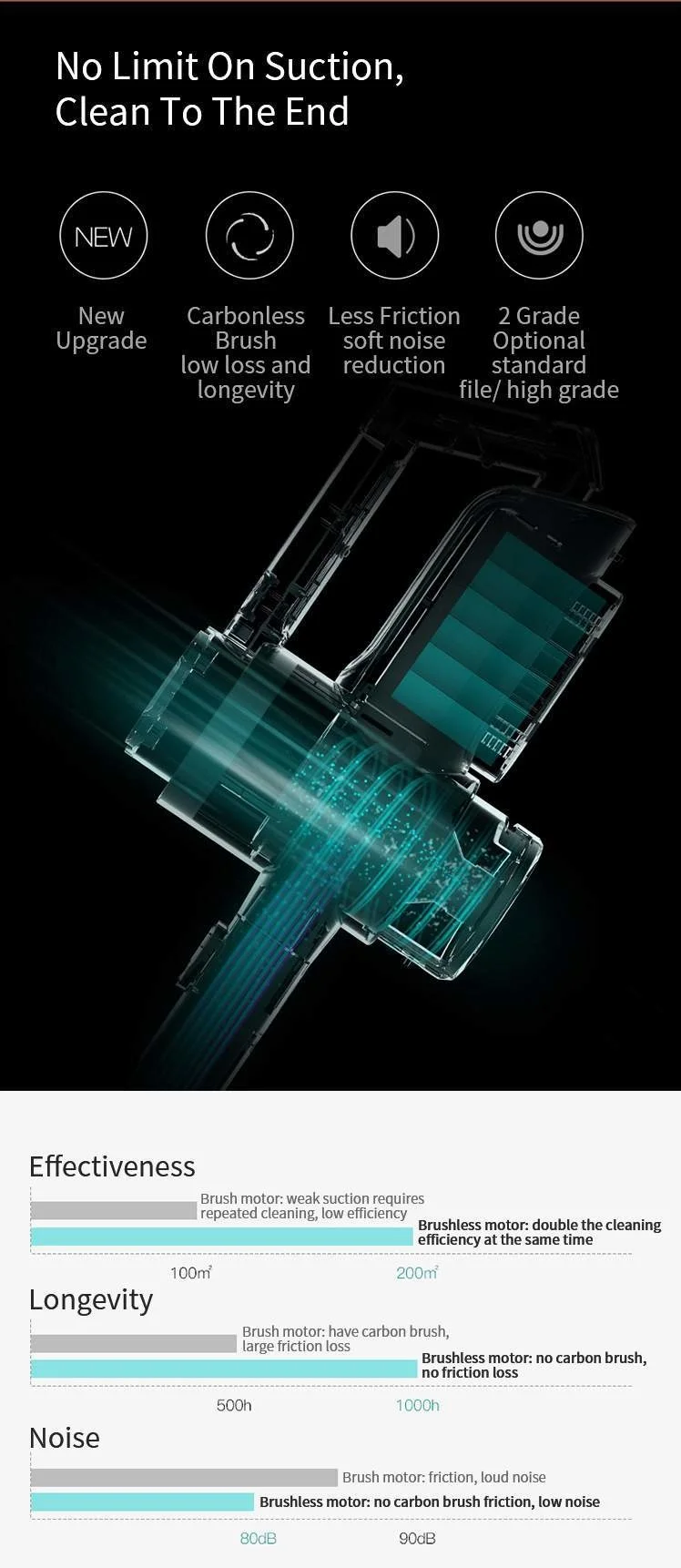 Достаточно быстро и безгранично впитывает, очищает до конца. Новый бесформенный брумстик имеет более длительный срок службы двигателя, меньше трения (уменьшение шума программного обеспечения) и предлагает 2 градусный вариант (стандарт 6000 Pa/Высокое качество 15000 Pa).