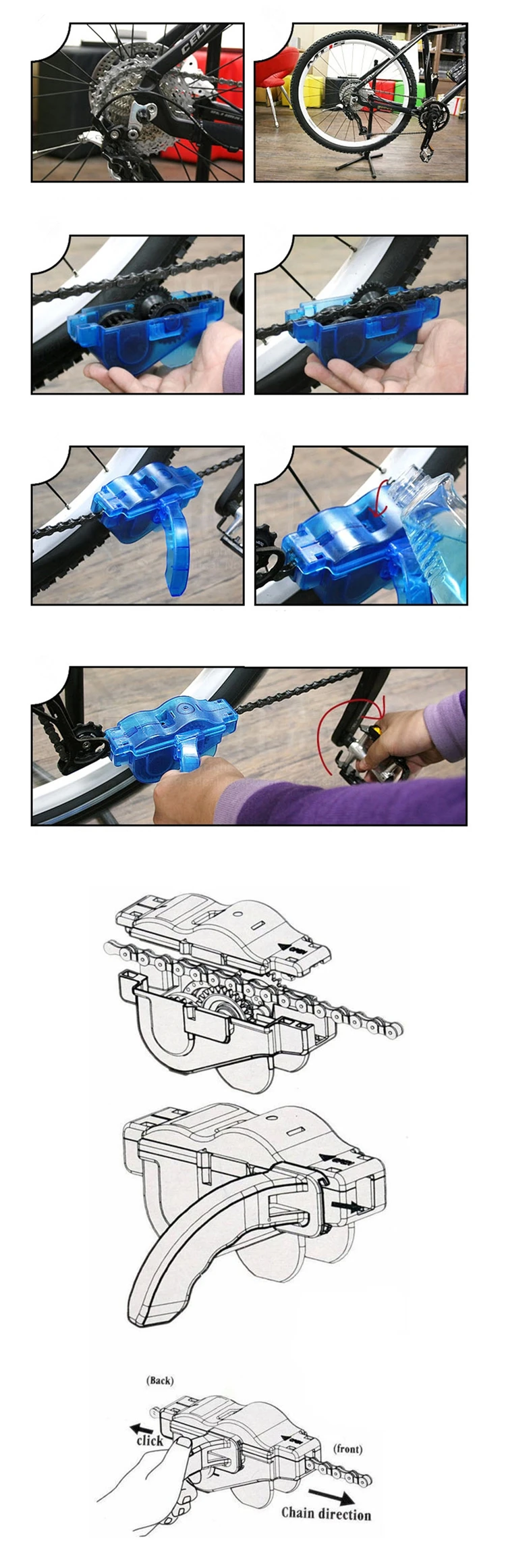 1. Откройте крышку сверху, залейте моющее средство, положите в цепь, закройте крышку 2. Загрузите ручку сбоку и зафиксируйте цепь 3. Удерживайте ручку и Поворачивайте цепь, пока цепь не станет чистой. 4. Удерживайте шрапнель, чтобы снять ручку, откройте верхнюю крышку, снимите шайбу цепи и сливайте сточную воду. 5. Мойте снова с моющим средством и водой, протрите цепь тканью 6. Не забудьте смазать цепь, чтобы предотвратить ржавчину.