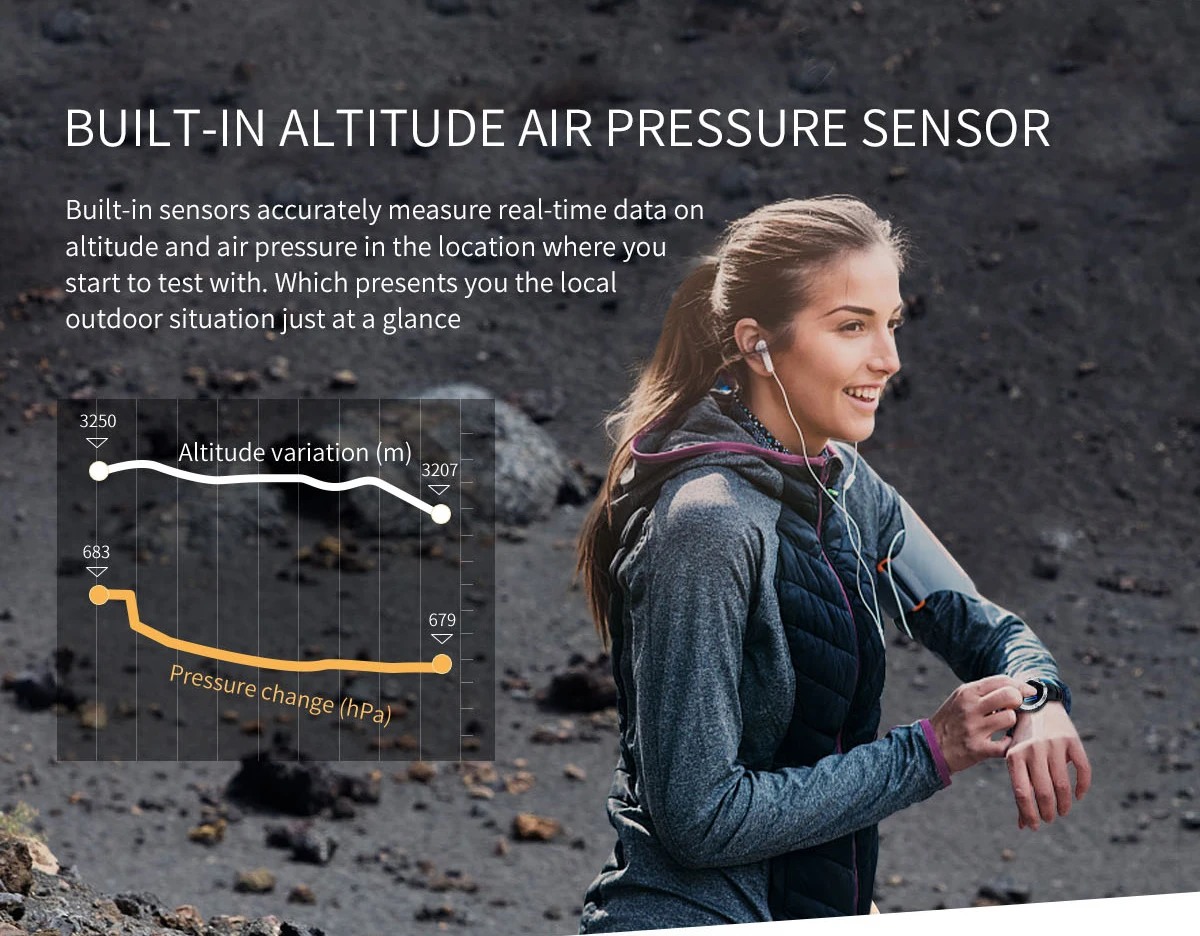 Встроенные датчики точно измеряют данные в реальном времени о высоте и давлении воздуха в месте, с которым вы начинаете тестировать. Который представляет вашу местную внешнюю ситуацию просто с первого взгляда.