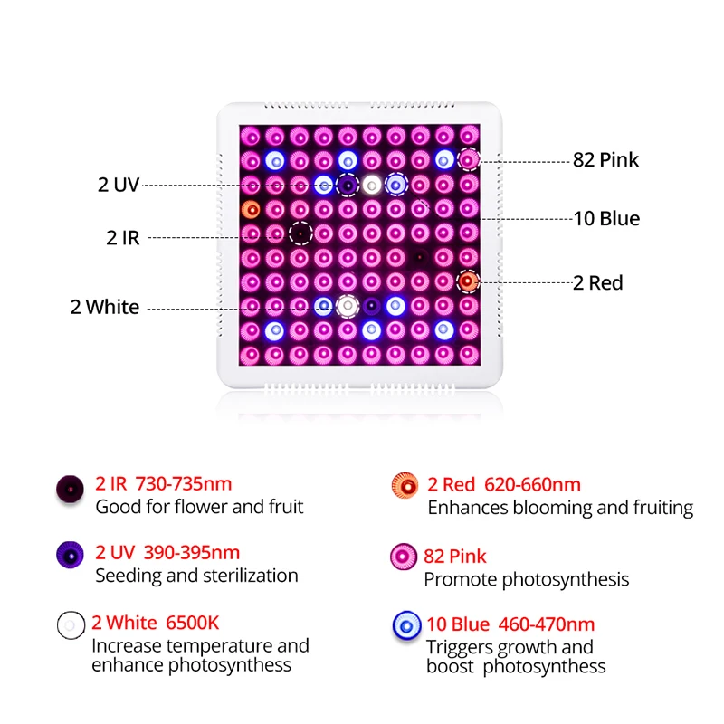 Применение: подходит для овощей, цветов, травяных растений и т. д. и подходит для всех растущих сцен. Продукты могут работать постоянно Внимание: не является водонепроницаемым, не моется под дождем или в воде. Выращивание советы: 1. Температура: 26,7 ~ 30, обогащение CO2: 1500ppm, потенциал 2. Рабочая среда для светильник-20 ~ 40 градусов Цельсия, 45% RH ~ 90% RH. 3. Потенциал водорода (PH) : 5,5 ~ 6,3 (почвы), 6,0 ~ 6,5 (деревянная) 4. Не трогать или перемещать, когда светильник работает. 5. Не блокируйте вход и выход воздуха, сохраняйте конвекцию воздуха, не смотрите на растущие огни непосредственно, когда они включены 6. Высокоподвесная лампа ослабит энергию и влияет на цикл роста растений, поэтому лампа не должна висеть слишком высоко. В то же время не подвешивайте светильник, чтобы растения были слишком закрыты, или это повредит растения. О 0,8 ~ 1,2 метра высотой является хорошим выбором. Черный корпус, 300 светодиодов Особенности: Чехол Цвет: полный спектр Светодиодный (количество): 300 шт. Мощность настенного шнурка: 900 Вт Светильник Цвет: 2700k / 660nm Входное напряжение: 85-265 В переменного тока Длина волны: полный спектр 380нм ~ 780нм Частота: 50 Гц/60 Гц Срок службы: более 50000 часов Размер продукта: 258*258*45 мм Белый корпус, 100 светодиодов Технические характеристики: Мощность: 300 Вт, макс. Размеры: 258 мм x 258 мм x 45 мм Вес нетто: 1150 г Рекомендуемое время работы: 12-18 часов в день Рекомендуемые расстояние: 11,8-27,6 дюйма Рабочая зона: макс. 2 ㎡ Мощность: 90-140V / 175-265V 50/60Hz Материал корпуса: алюминий, поликарбонат