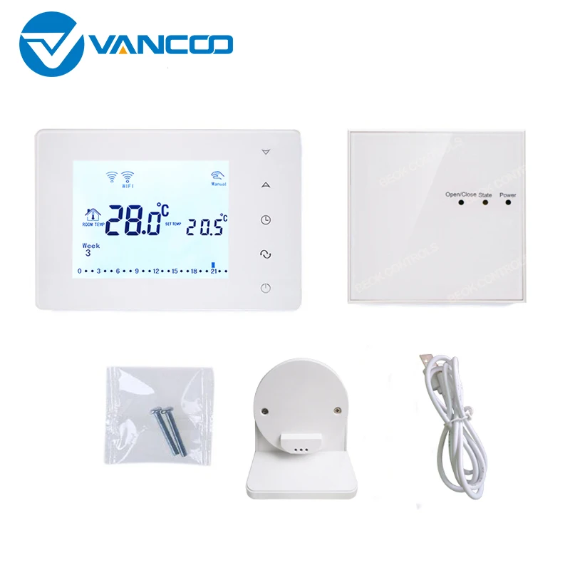 Высококачественный термостат для системы отопления газового котла, с сенсорными кнопками для простой работы. ЖК-дисплей с подсветкой для четкого отображения данных, легко считывать данные даже в темноте. Недельный программируемый и 5 + 2,6 + 1,7 дней, шесть циклов программируемый для максимального комфорта и экономии хорошо регулируются. 0,5 °C точность, сохраняя комфортной температуры в рамках одного уровня вы установите. Функция памяти данных при выключении питания Функция блокировки для детей Пульт дистанционного управления с помощью приложения, удобный для вас, чтобы управлять термостатом с помощью мобильного устройства. Голосовое управление, Совместимость с Amazon Alexa, Google Home,