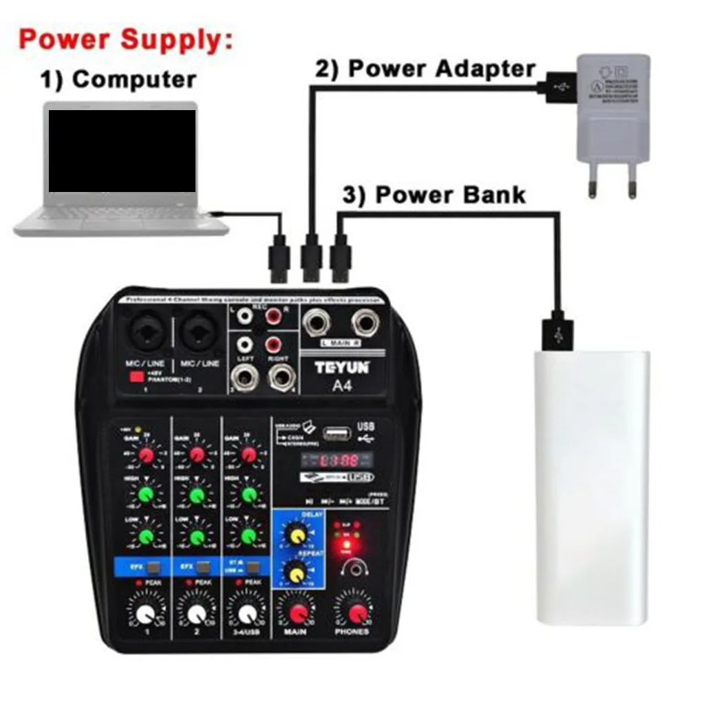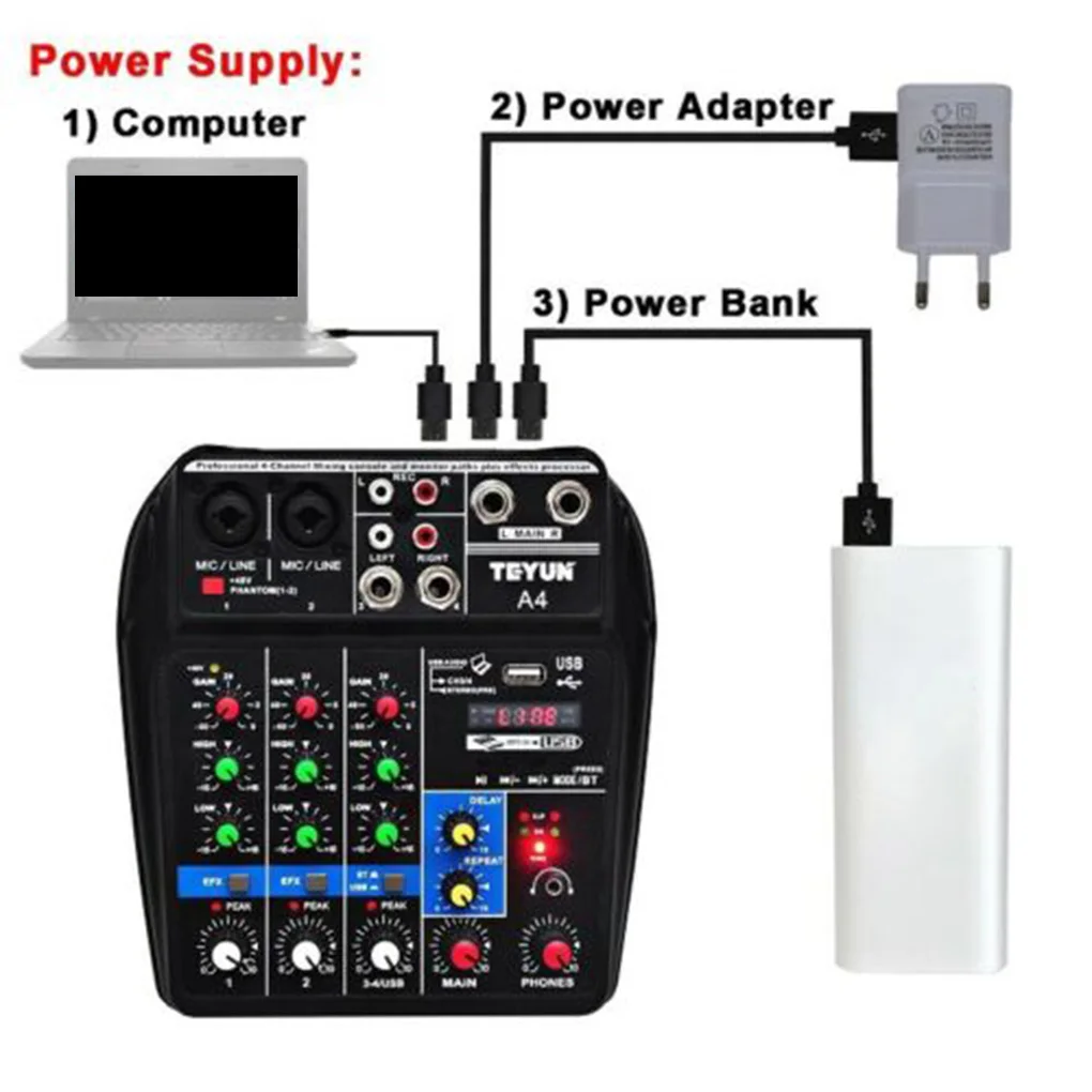 Миксер оснащен входным усилением и высокой регулировкой басов, встроенный фантомный блок питания 48 В для конденсаторного микрофона, прямой источник питания, выход гарнитуры высокой четкости, MP3 вещание, устройство со звуковой картой может быть непосредственно подключено к ПК.