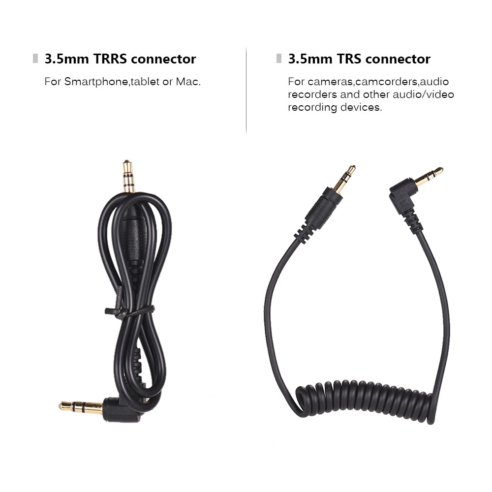 Также поставляется с 3,5 мм TRS выходной кабель (для цифровых зеркальных камер, видеокамеры, видеорегистраторы) и 3,5 мм TRRS выходной кабель (для смартфонов, Планшеты и Mac).