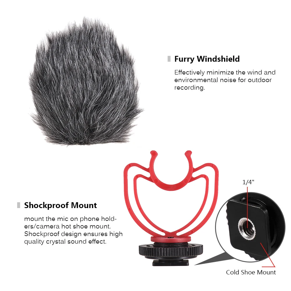 В комплект входит профессиональное пушистое ветровое стекло и амортизирующая сумка для переноски. Прилагаемое Противоударное Крепление может эффективно уменьшить нежелательные помехи, кабель и шум в обращении.