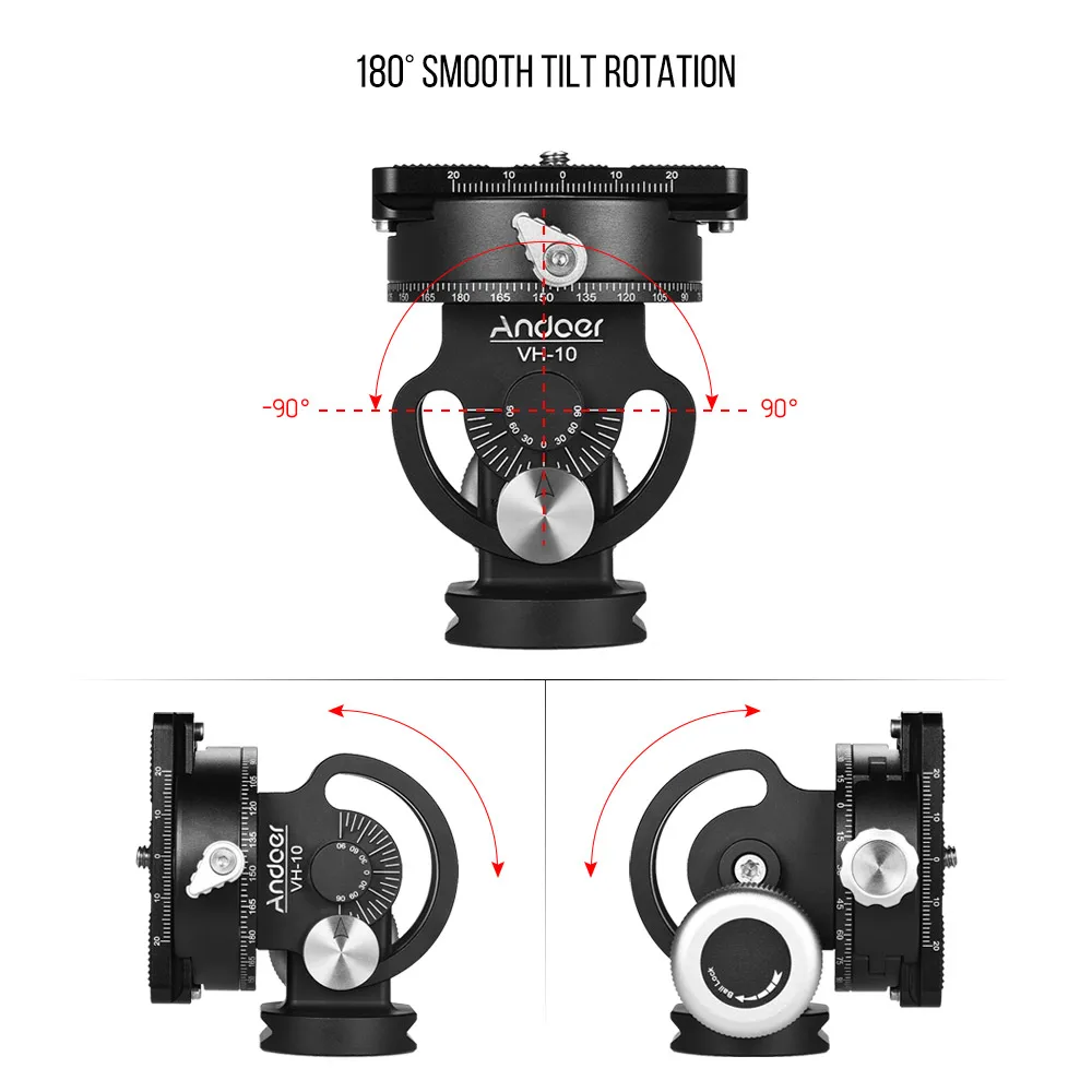 Andoer VH-10 алюминиевый сплав Штативная головка-это отличный помощник для панорамной съемки, а также для наблюдения за птицами. Поддерживает вращение на 360 °, наклон +/-90 °. Процесс очень гладкая.