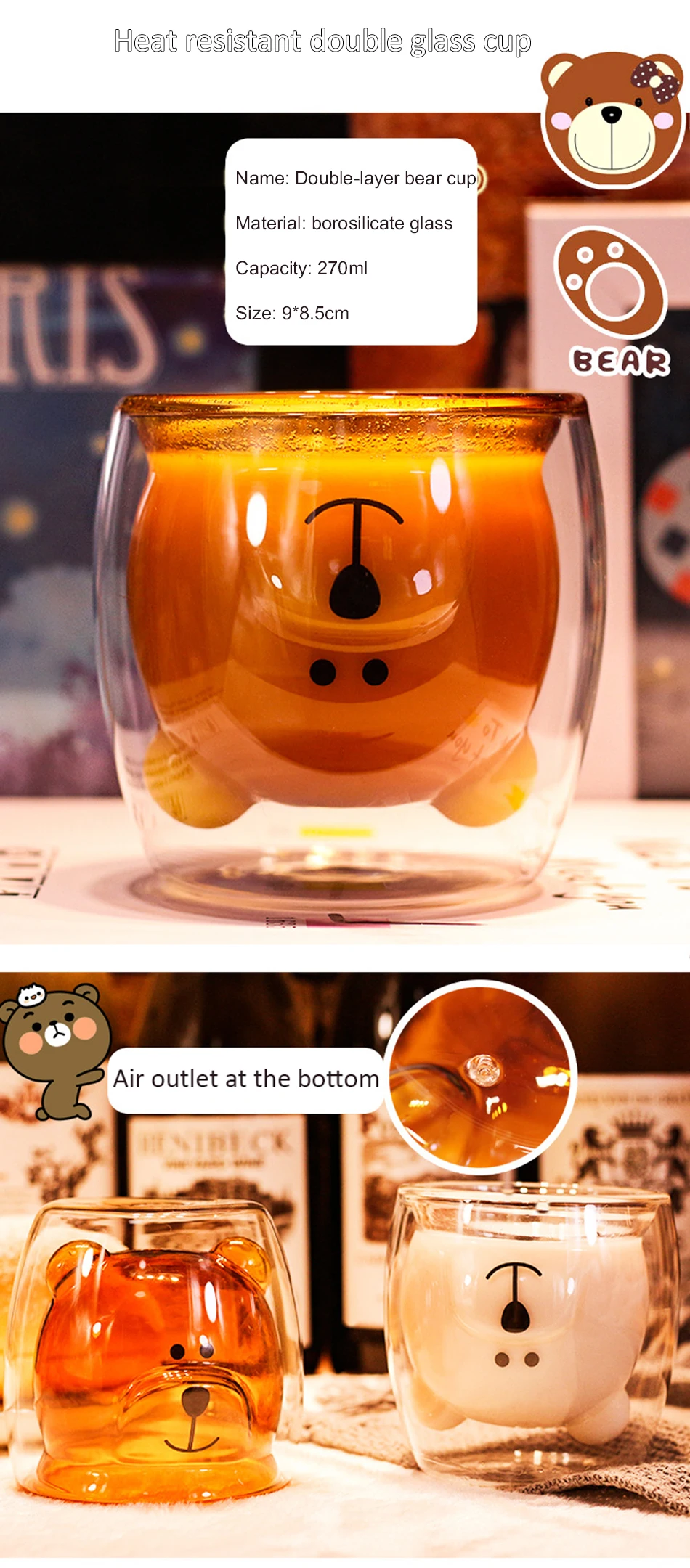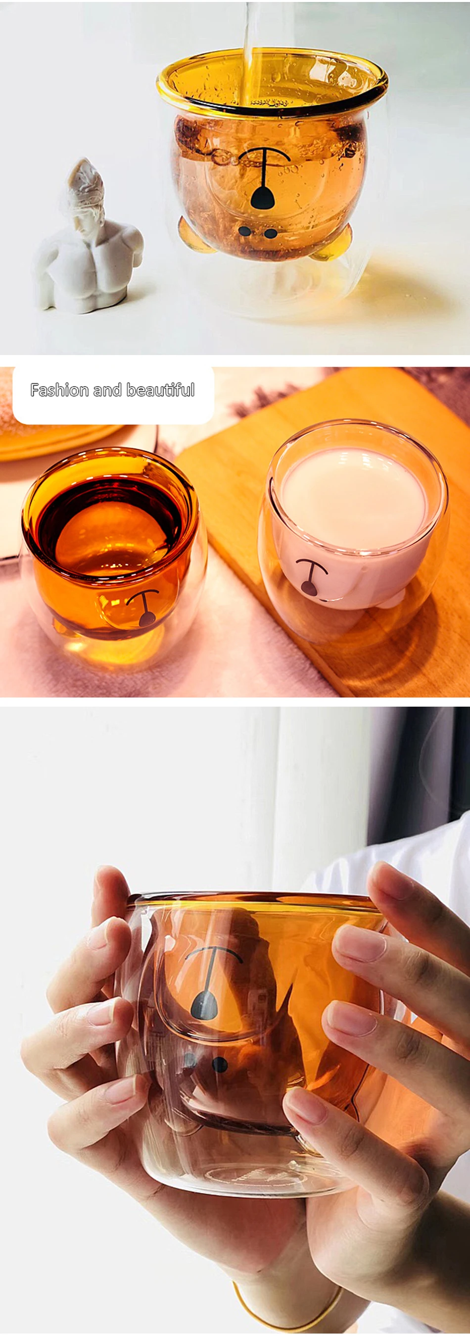 100% новый бренд высокого качества. Характеристика: Инновационный стиль кофейной чашки. Очень свежий и привлекательный. Идеально подходит для кофе или других напитков. Уникальный, свежий и привлекательный дизайн. Подходит для использования в семьях, вечеринках, барах и любых других случаях, идеально подходит для личного использования. В основном используется для хранения водки, виски и других вин. Изготовлен из высококачественных материалов, его нелегко сломать. Параметр: Название продукта: двойная кофейная чашка с милым медвежонком Цвет изделия: Прозрачный Материал изделия: боросиликатное стекло Термостойкость: -20 ° C - 150 ° C Емкость: 270 мл Размер продукта (прибл.): 8*8,5*7 см, диаметр рта бутылки: 8,5 см, высота рта бутылки: 9 см, дно бутылки: 7 м Вес продукта: около 150 г