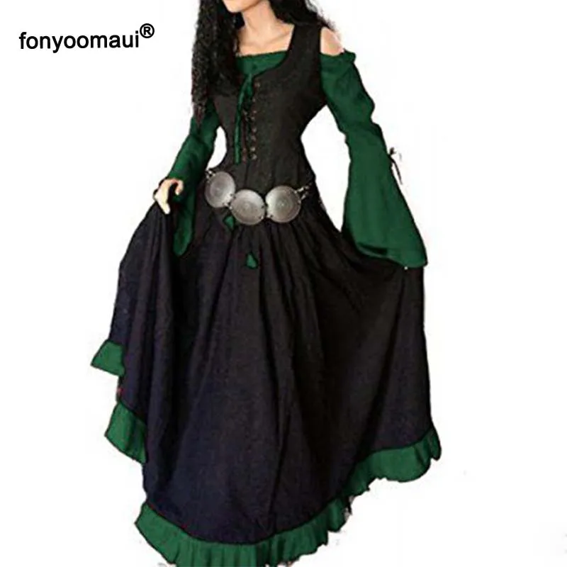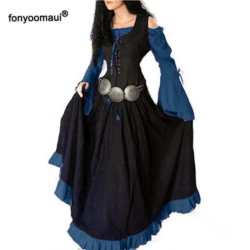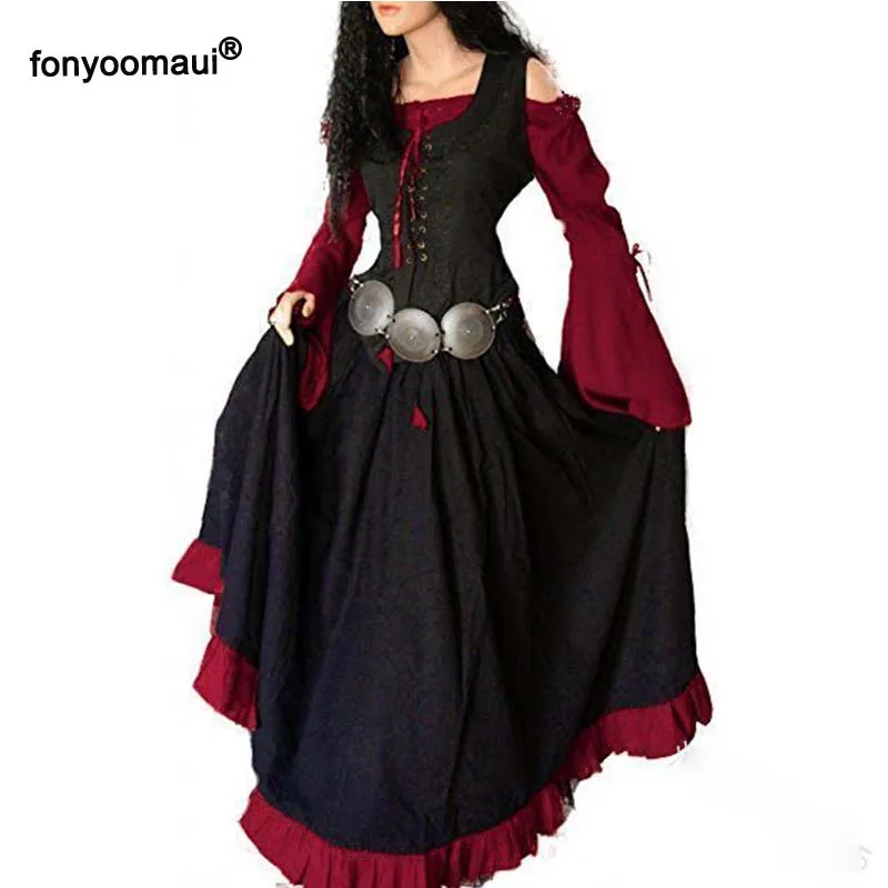 Хэллоуин Cos средневековый винтажный комплект из 2 предметов, тонкое платье макси, костюм для взрослых женщин ренессанс, платье на шнуровке, платье, Несимметричное платье