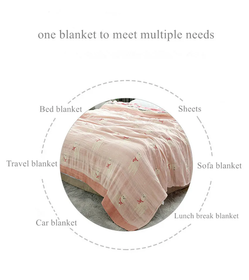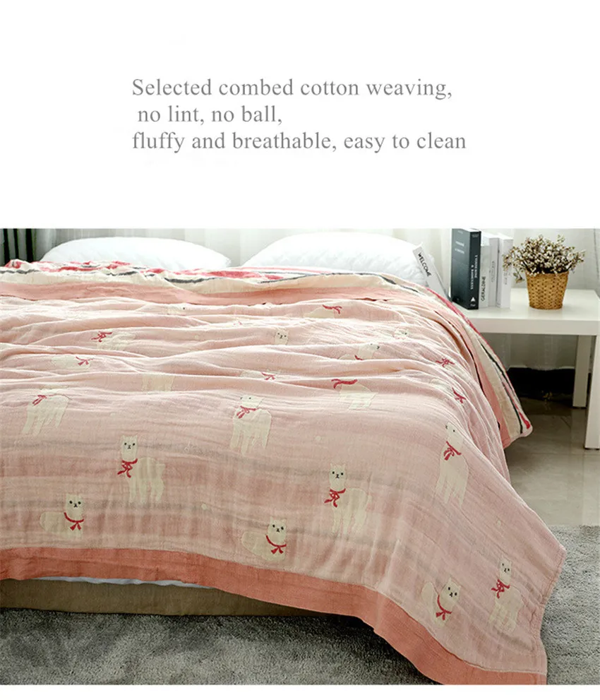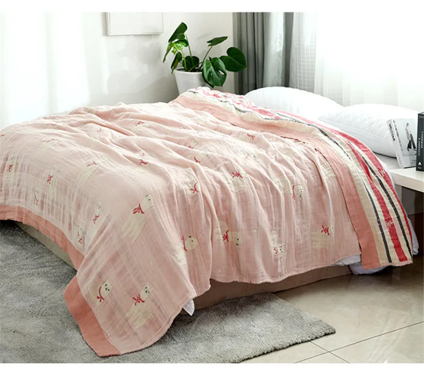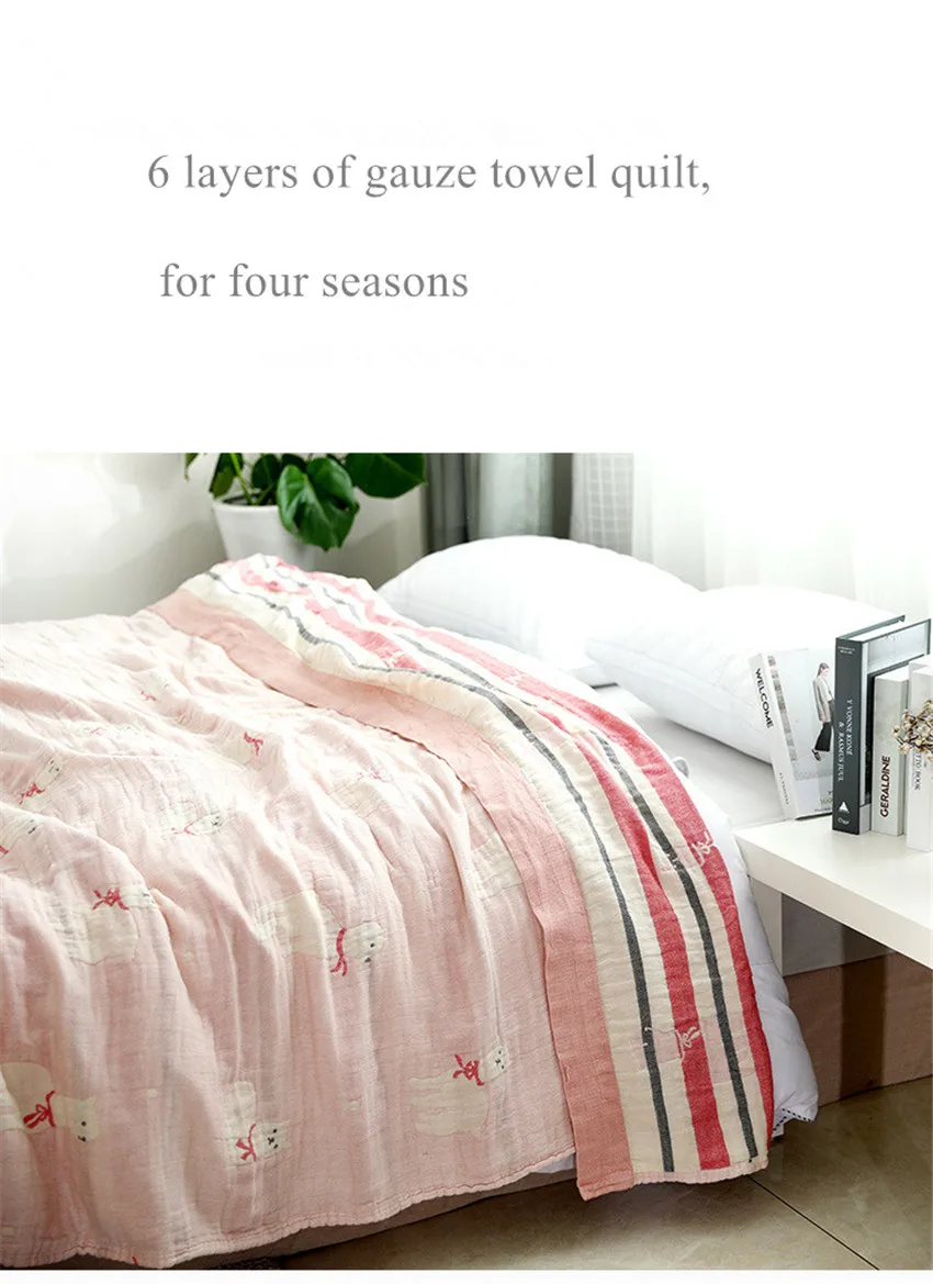 Наименование: 6 слоев газового полотенца из альпаки Размеры: 150*200 см/200*230 см Вес: 1000 г/1500 г Характеристики: Предпочтительная ткань, не легко выцветает, безопасна и экологически безопасна. Удобные, дышащие, мягкие, универсальные Посылка: 1 одеяло