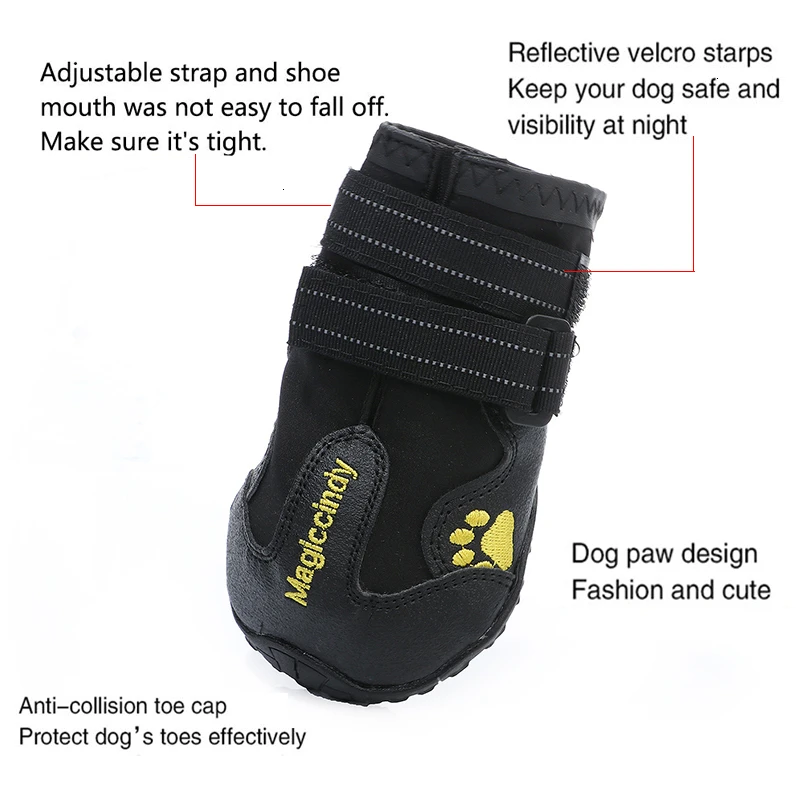 SAFE and ADJUSTABLE: Easy to put on/off. This dog shoe features a wide slit opening and two adjustable reflective Velcro straps for a tight fit that keeps your dog safe at night.