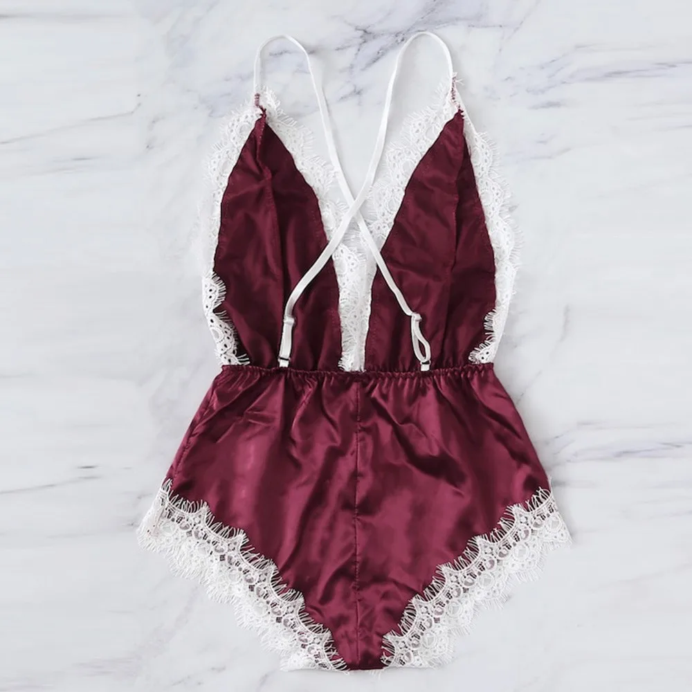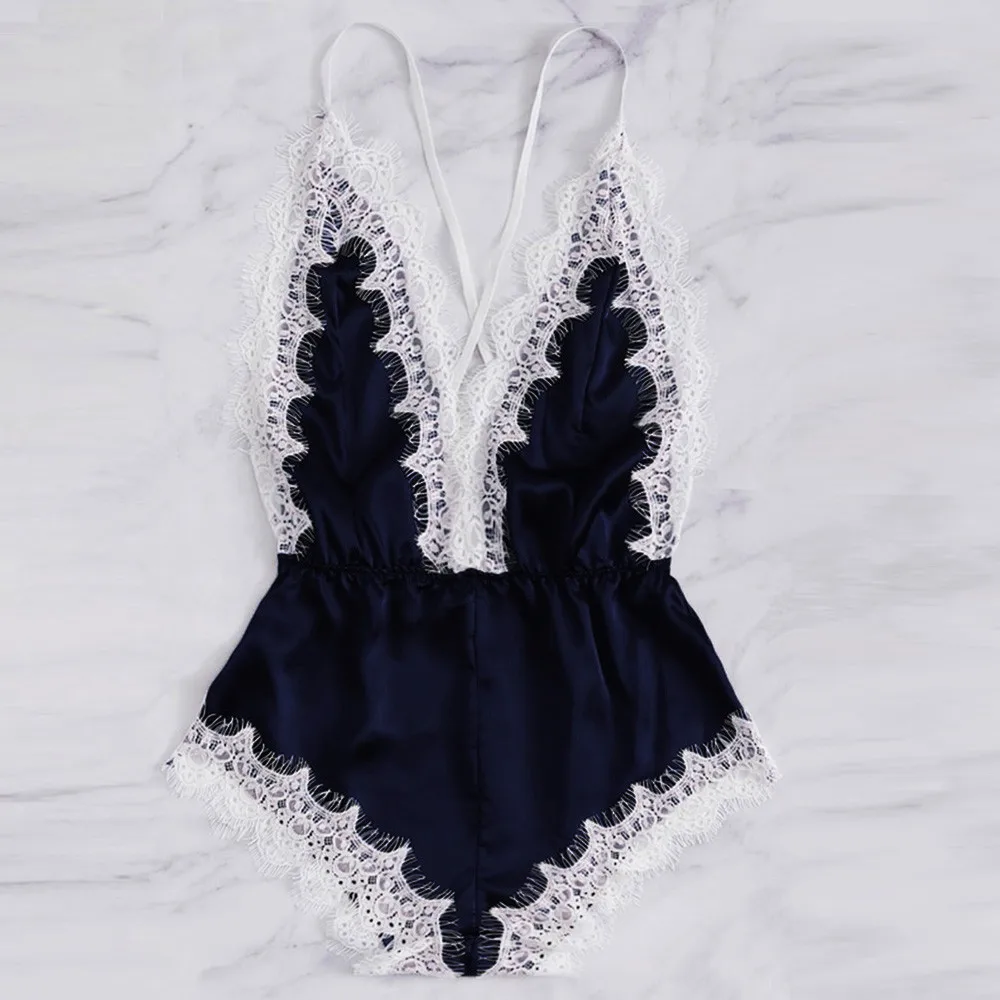 New Fashion Sissy Bodysuits Women Sexy Lingerie Girl V-neck Lace Splice Bodysuit Sleepwear Solid Color Seamless Teddies Latex