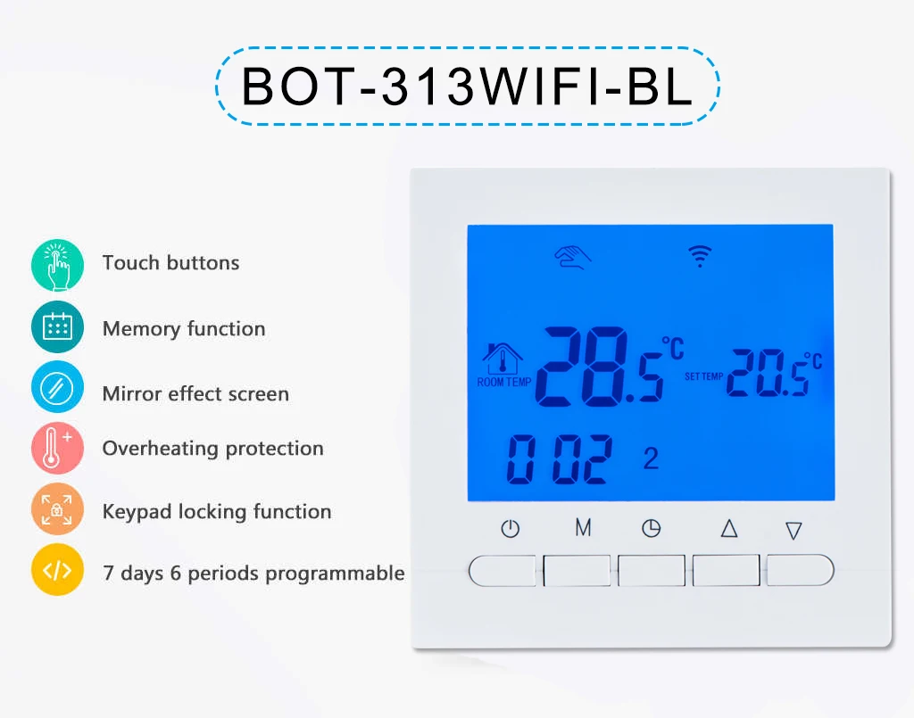 ЖК-дисплей с задней светильник, легко читается. Ручной режим или режим контроля периода для различных целей. Автоматическое получение температуры, точность 1 °C удерживает температуру в пределах установленного Вами уровня. Не нужно беспокоиться о сбое питания, памяти данных, когда питание выключено. Еженедельная программируемая функция, 5 + 2 или 6 + 1 или 7 дней программа является необязательной Функция блокировки для детей. Избегайте неправильной работы термостата для детей