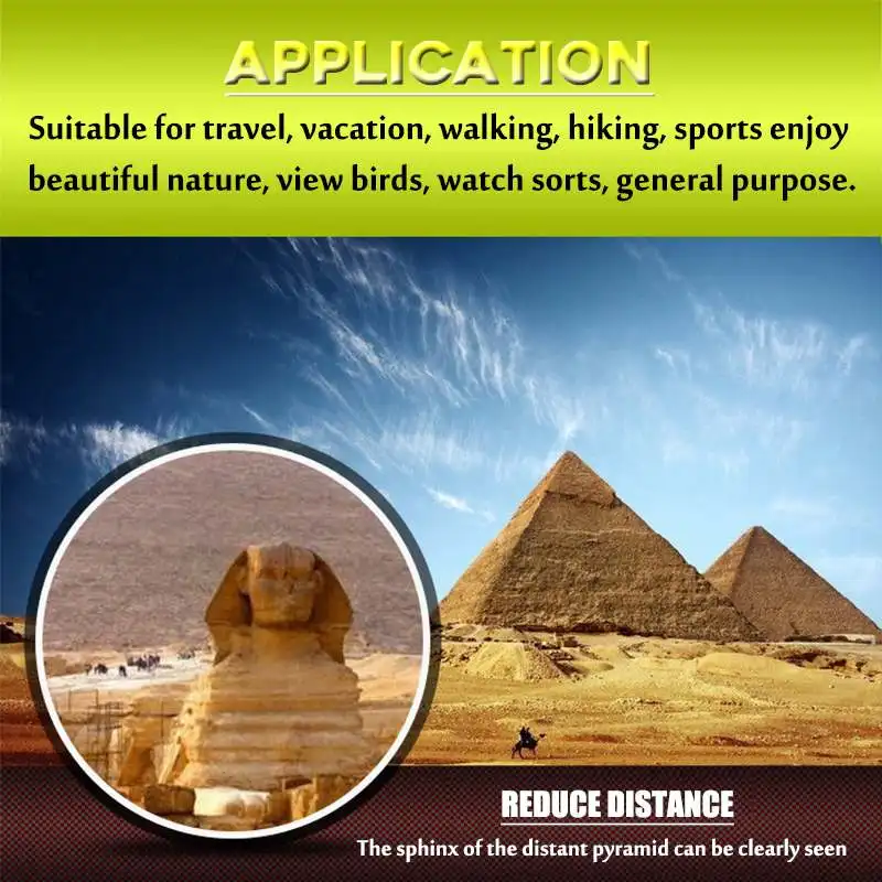 Применение: подходит для путешествий, отдыха, прогулок, пеших прогулок, занятий спортом, наслаждайтесь красивой природой, вид птиц, вид часов, общее назначение.