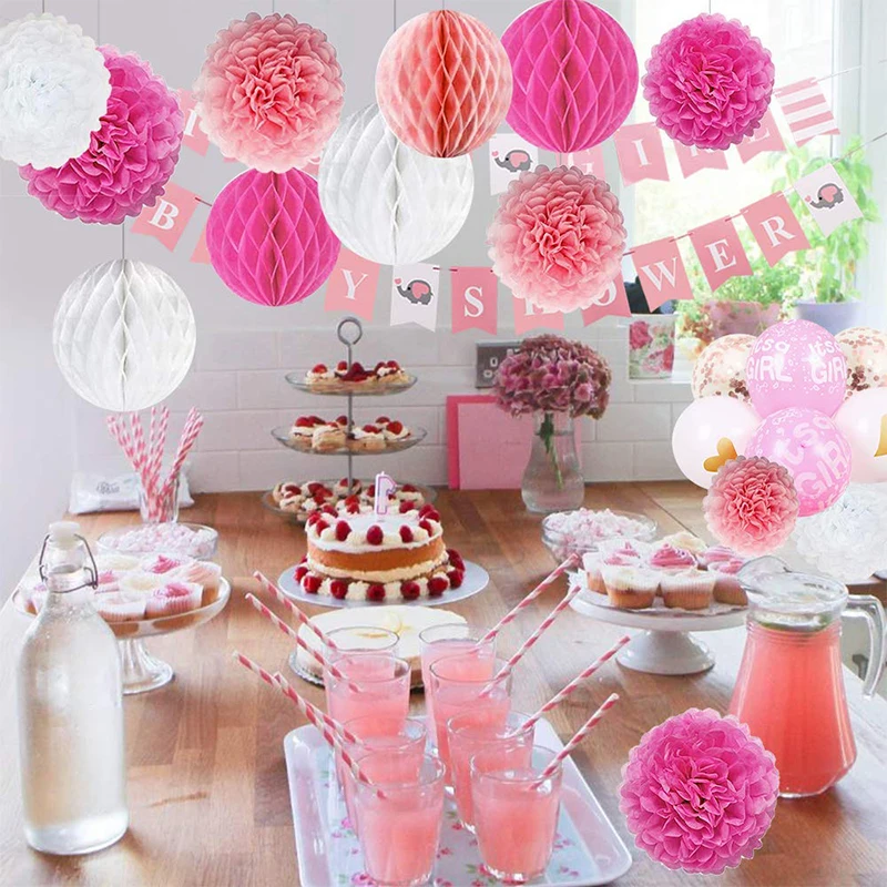 Декоративный набор для девочек-2 шт. это баннеры для девочек, детские воздушные шары в виде слона из розовой фольги, 2 шт./Золотые воздушные шары в виде любви из 4 шт./розовые воздушные шары в стиле «Это девочка» из 4 предметов/золотистые воздушные шары с блестками из 4 предметов и 9 бумажных тканевых помпонов, 3 бумажных медовых шара, 1 бумажная кисточка (три цвета, каждый цвет 5 шт.), 3 рулона 5 м серебристых лент.