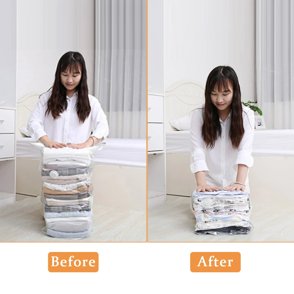 Параметры: Материал: PA + PE Размеры: 40*60 см, 45*70 см, 56*80 см, 80*100 см, 50*70*30 см. Цвет: Прозрачный Особенности: Простота в эксплуатации, экономия пространства; Легкие и тонкие, износостойкие; Хорошее уплотнение и оптимальное сжатие; Используется высококачественный полиамид + полиэтилен; Центробежный подвесной клапан для быстрого разгрузки газа. Способ использования: Положите одежду прямо в сумку и закрепите ее с помощью зажима с обеих сторон, выдавите вакуумный пакет. Посылка включает в себя: 1x компрессионных мешков