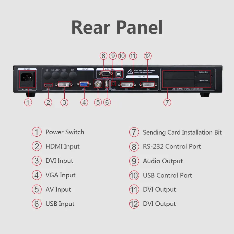 Несколько видео входов -- серия MVP300 использует 5 каналов видеовхода, включая 1 Композитный видео AV (CVBS), 1 канал VGA, 1 канал DVI, 1 канал HDMI, 1 канал USB. В основном, потребности для гражданского и промышленного использования были покрыты. Бесшовное переключение всех видео входов. Интерфейс видеовыхода -- серия MVP300 имеет 2 DVI видеовыхода, 2 видео запрограммированы на выход, светодиодный дисплей или карту отправки. Бесшовное переключение любого канала-видеопроцессор серии MVP300 также может легко переключаться между любыми каналами, быстро переключаться.