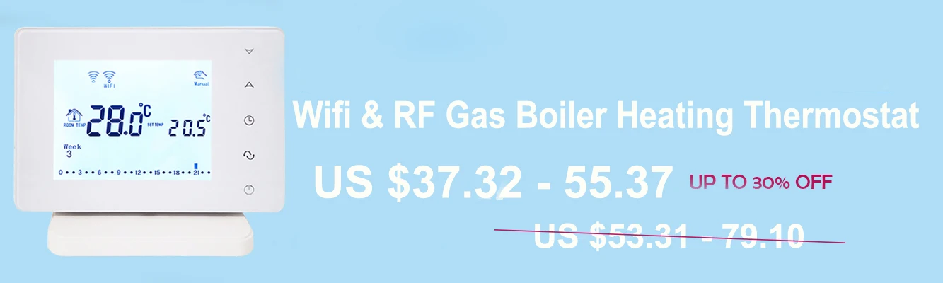Газовый котел, нагревательный термостат, WIFI и RF беспроводной тип. Весь набор содержит корпус термостата, приемник и кронштейн. Когда покупатель получит термостат, Корпус термостата с кронштейном может стоять на вашей мебели. И когда покупатель не дома, он может использовать телефон для управления термостатом.