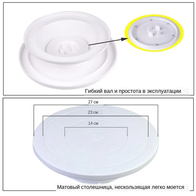Легкая платформа обеспечивает устойчивость вашего торта при создании нежных цветов и написании. Платформа поворачивается в любом направлении для легкой глазури, границ, расчесывания и выравнивания. Отлично подходит для пользователей с левой или правой стороны.