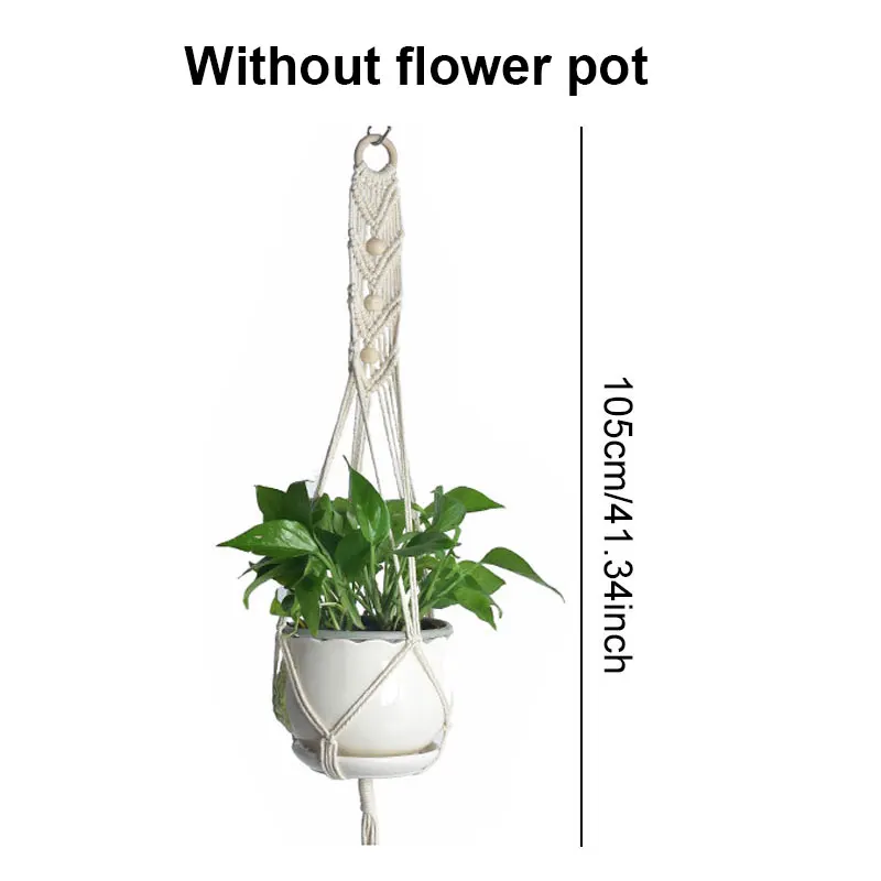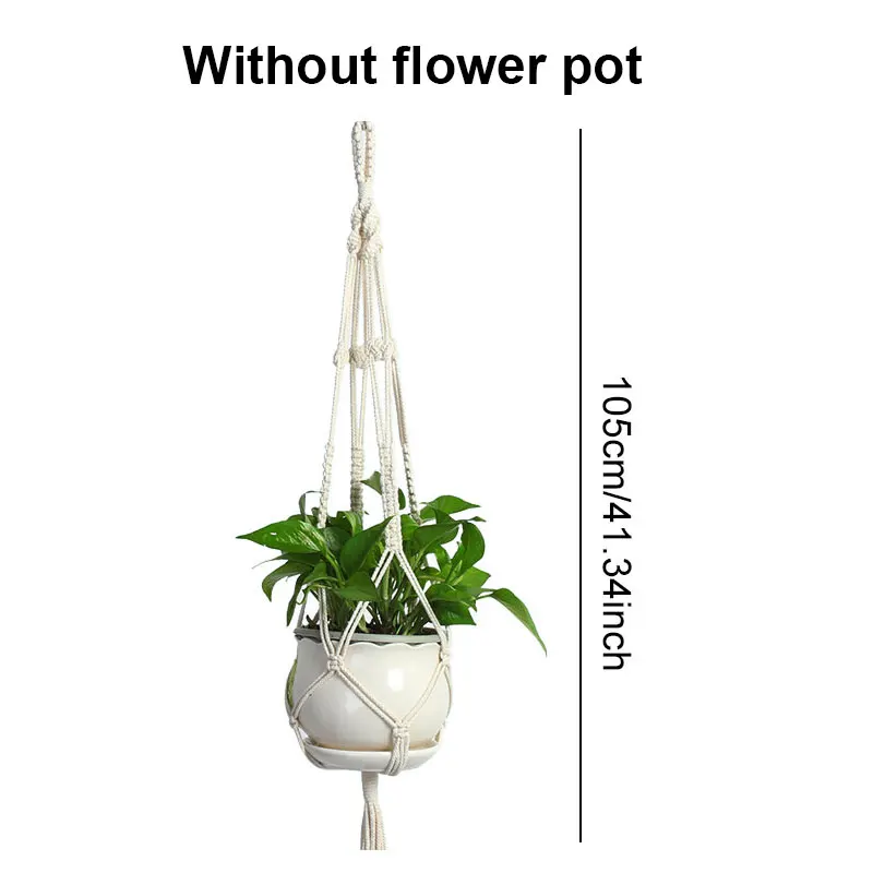 Parameters: Name: plant hanger Size: As the picture shows Material: cotton and linen Features: Application: This product is suitable for flowerpots in 20cm / 7.87in diameter and in 18cm / 7.09in height. Use: This product widely used in landscape engineering, garden landscaping, office greening, shopping malls, hotels balconies and gardens is well received among flower lovers thanks to its simple layout and light weight for spatial greening.