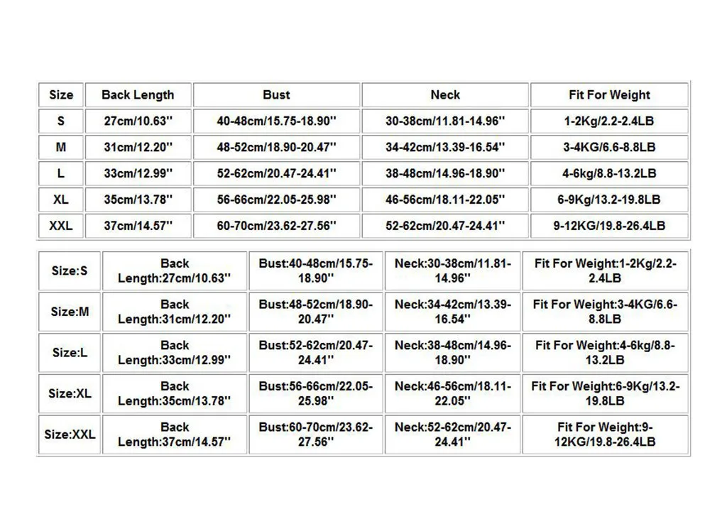 Размер Задняя Длина Обхват груди Шеи Подходит для Вес S 27 см/10,63'' Большие размеры 40-48 см/15,75-18,90'' 30-38 см/11,81-14,96'' 1-2 кг/2,2-2.4LB М 31 см/12,20'' 48-52 см/18,90-20,47'' Большие размеры 34-42 см/13,39-16,54'' 3-4 кг/6,6-8.8LB L 33 см/12,99'' 52-62 см/20,47-24,41'' Большие размеры 38-48 см/14,96-18,90'' 4-6 кг/8,8-13.2LB XL 35 см/13,78'' Окружности головы 56-66 см/22,05-25,98'' 46-56 см/18,11-22,05'' 6-9 кг/13,2-19.8LB XXL 37 см/14,57'' 60-70 см/23,62-27,56'' 52-62 см/20,47-24,41'' 9-12 кг/19,8-26.4LB