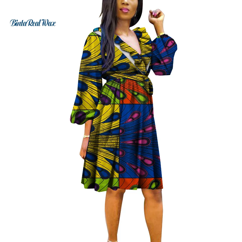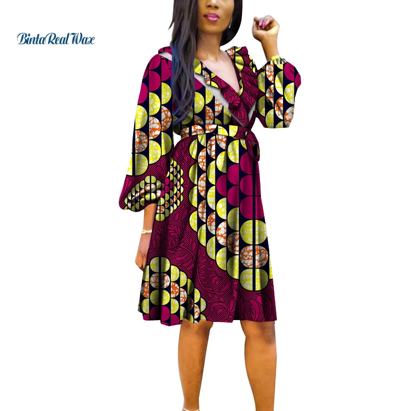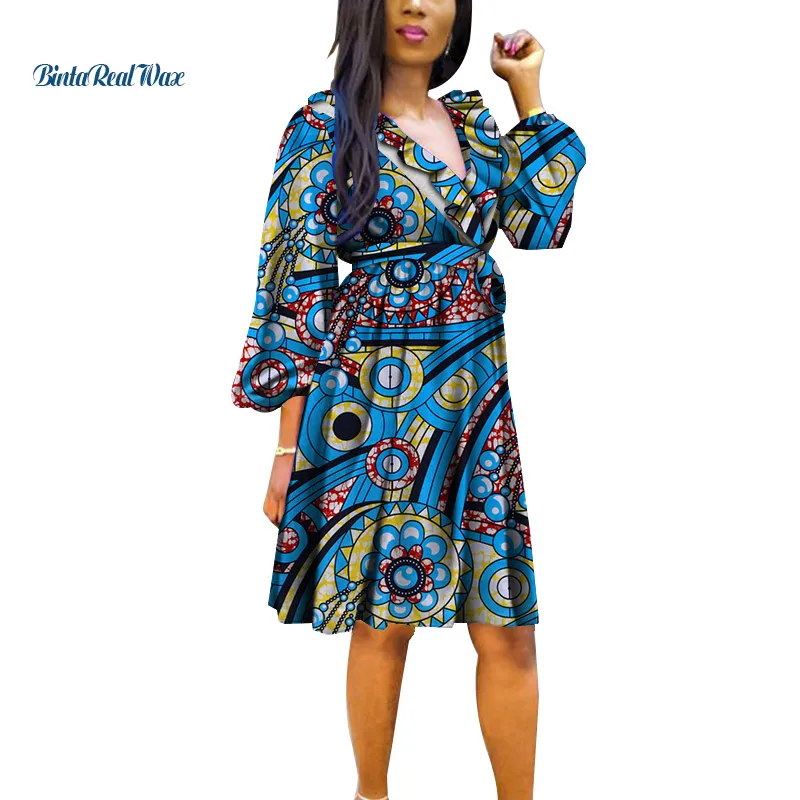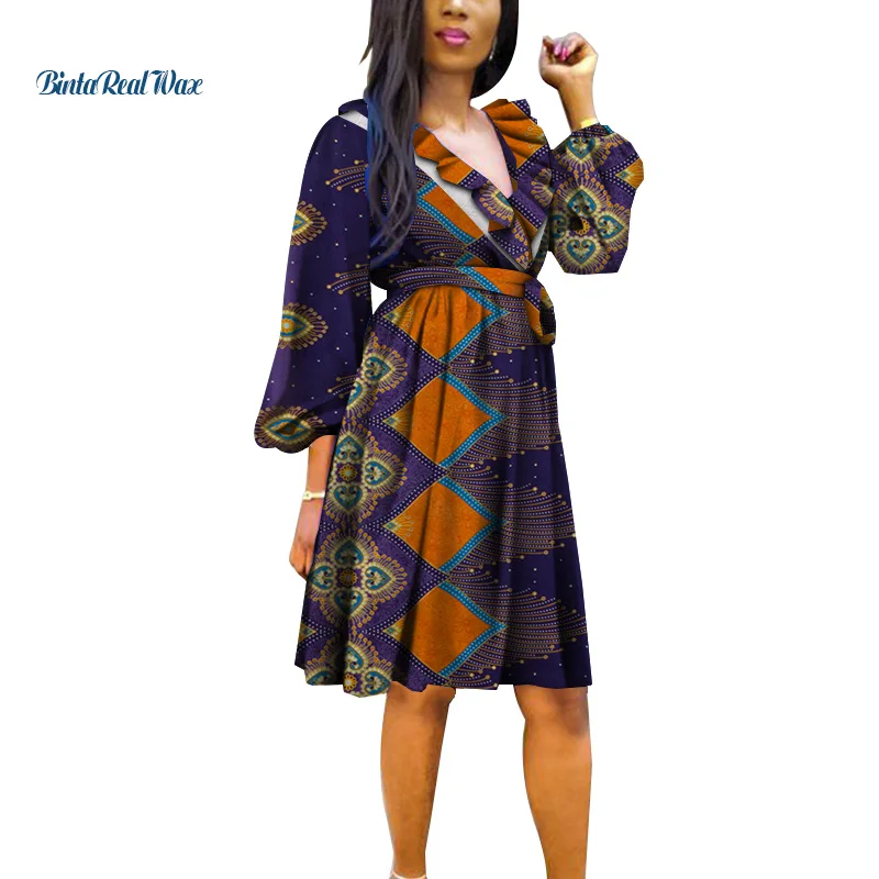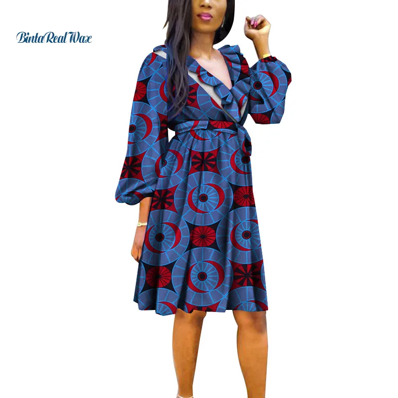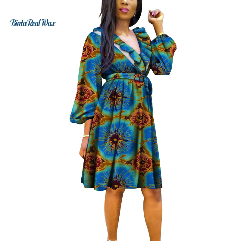 Платья в африканском стиле для женщин; Платья в стиле пэчворк с вощеным принтом; Одежда в африканском стиле; Платья с рукавами с оборками; WY5147