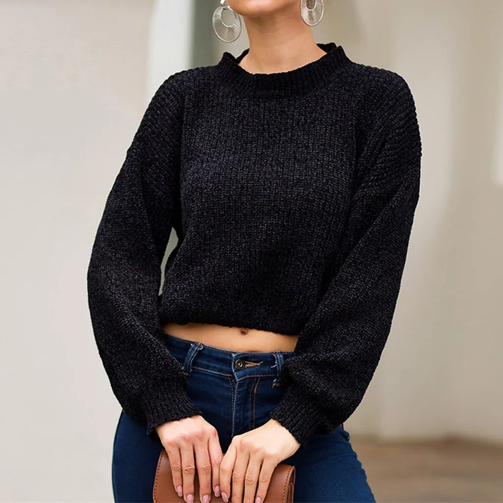 Pullover Plus Size Women Knitted Solid Long Sleeve O-Neck Sweater Short Blouse