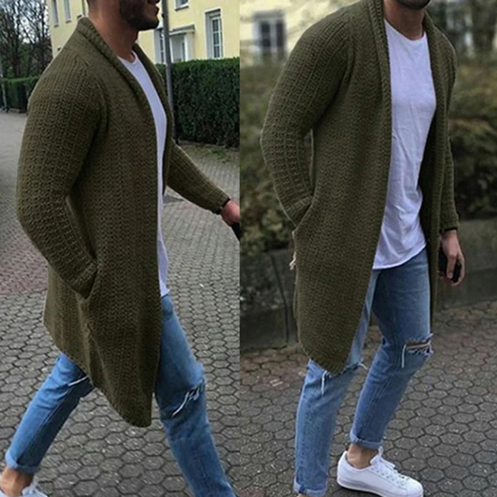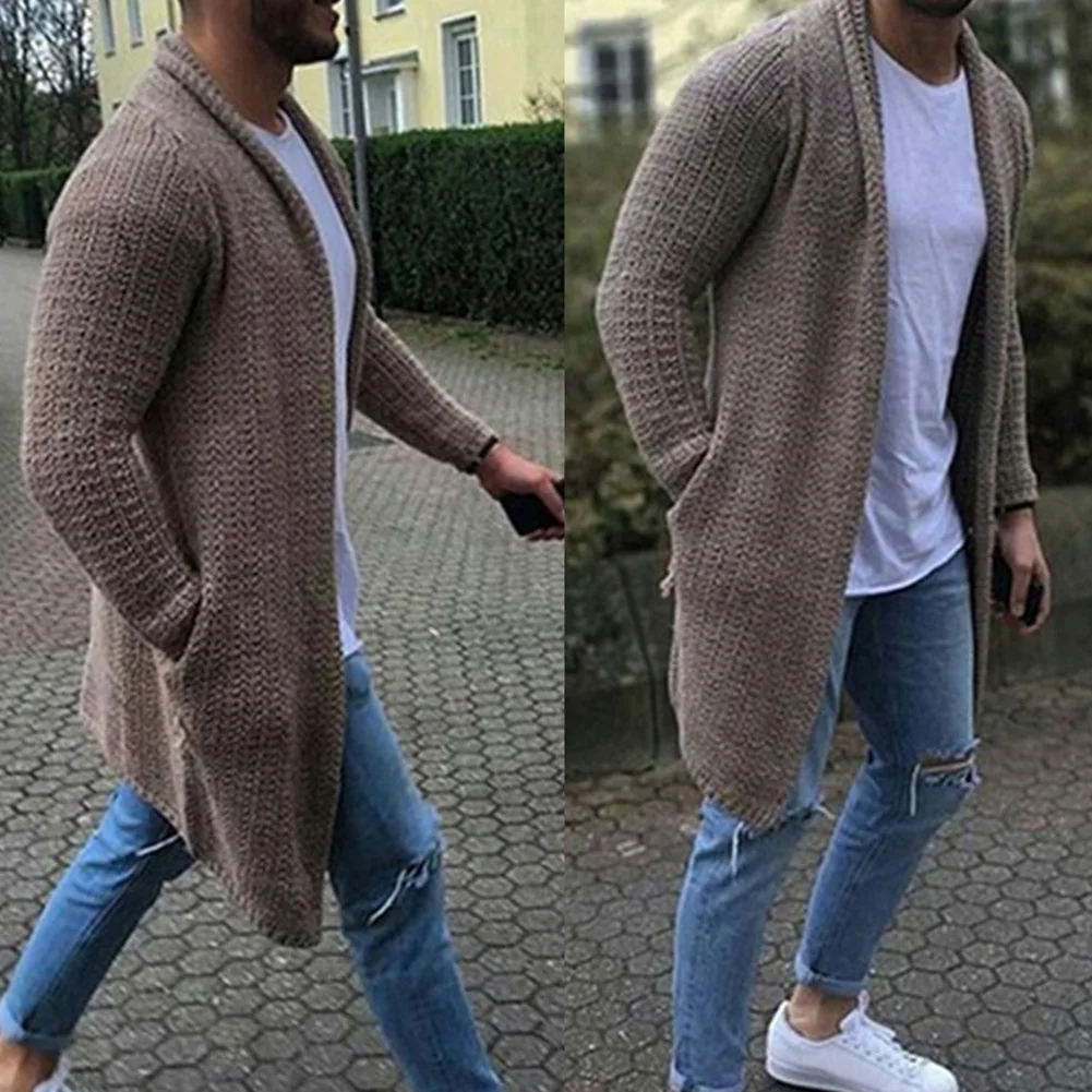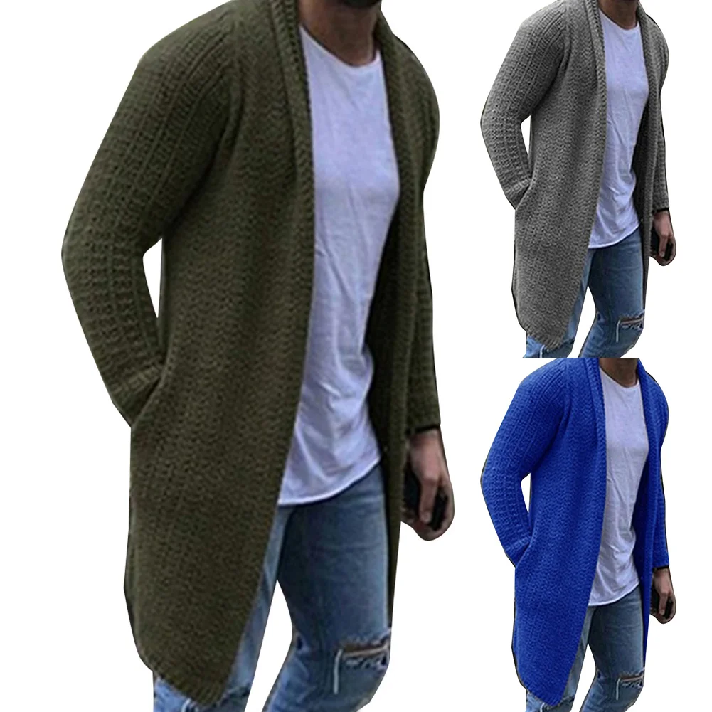 Модный мужской длинный кардиган, Повседневная Свободная однотонная трикотажная куртка большого размера с лацканами и карманами