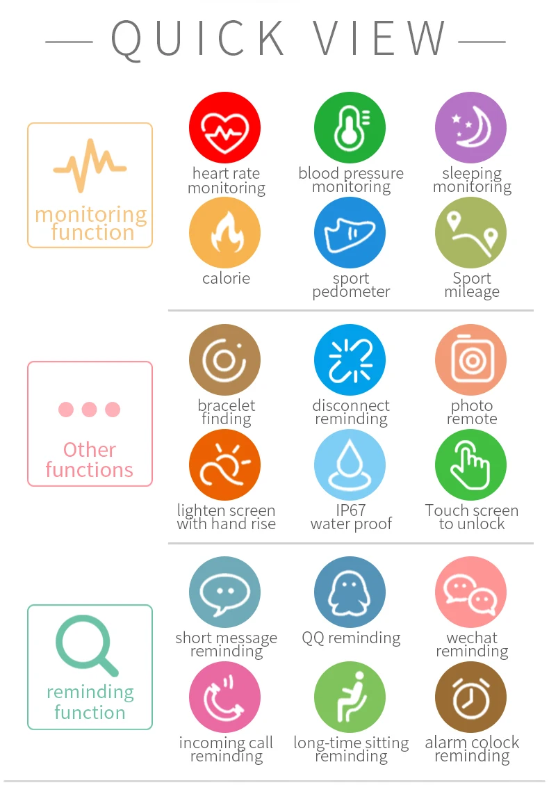 Другие функции, шаг, калории, расстояние, монитор сна, спорт, напоминание о звонке, напоминание о тревоге, поднимите руку, часы, зажигалка, Social share(wechat, QQ, Facebook, Twitter, встряхните руку, чтобы взять фонто; Цветной экран непрерывного сердечного ритма; Мотора patten (спортивная ходьба, бег, альпинизм, езда на велосипеде, плавание, баскетбол, бадминтон, футбол, пинг-понг)