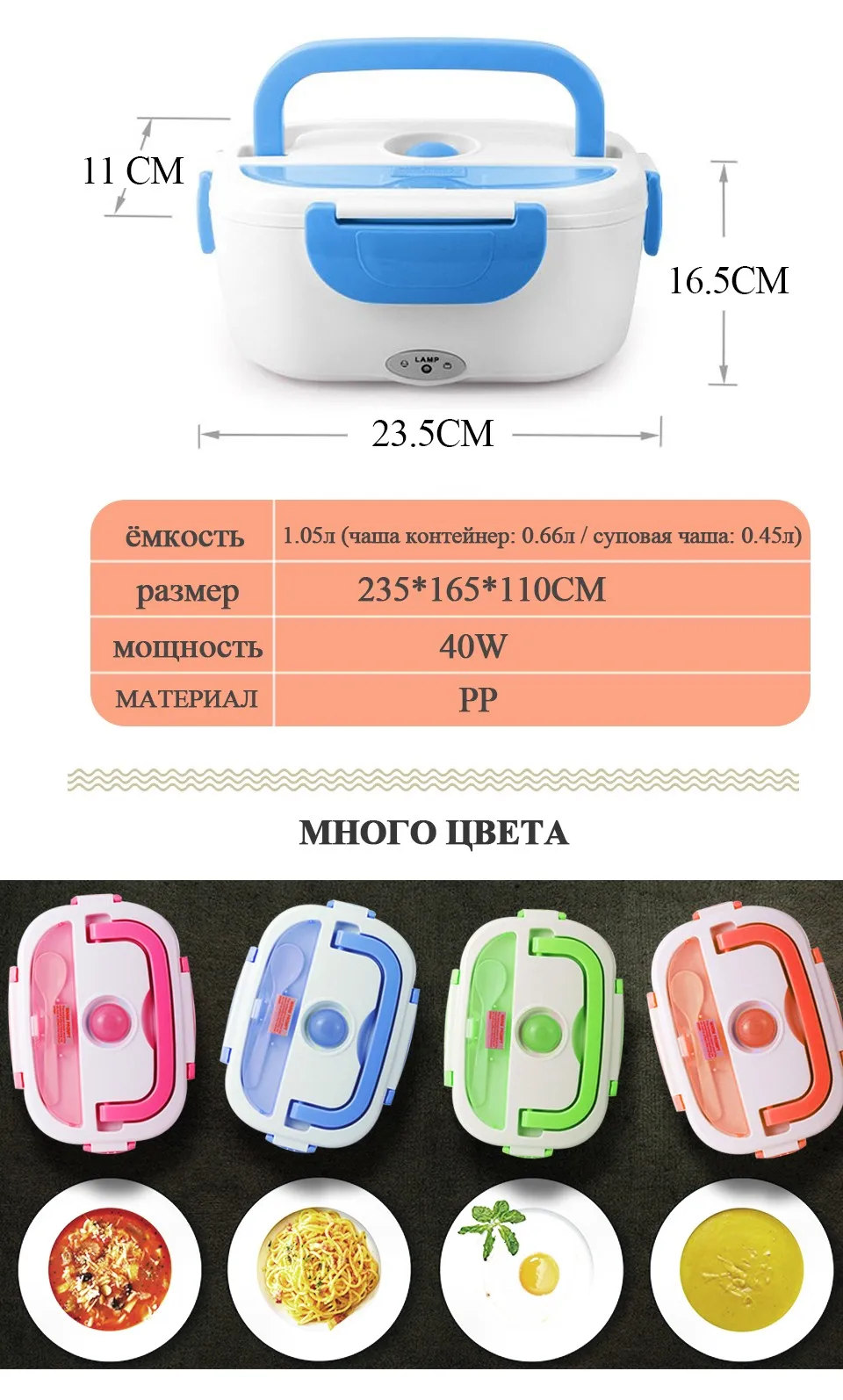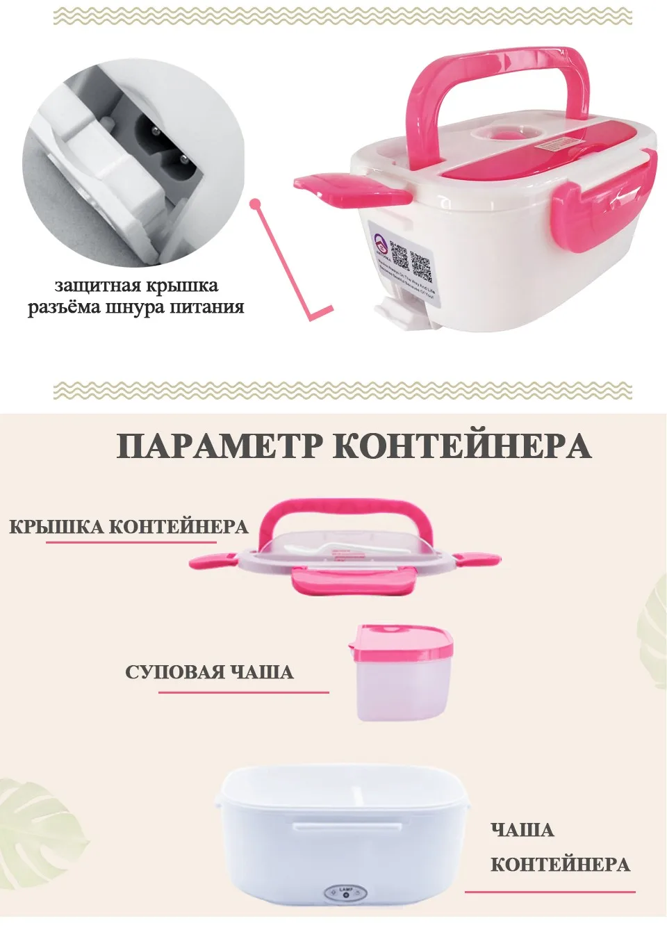 Подогрев пищи: 1. Пожалуйста, положите приготовленную еду в контейнер для риса и контейнер для посуды. 2. Откройте пробку и вставьте шнур питания. 3. Импульсный источник питания, индикатор питания и запуск супа. Примечание: время нагрева зависит от количества риса, овощей и температуры в помещении. Нагревательный суп: 1. Пожалуйста, положите приготовленный суп в Ланч-бокс. 2. Откройте пробку и вставьте шнур питания. 3. Импульсный источник питания, индикатор питания и запуск супа.