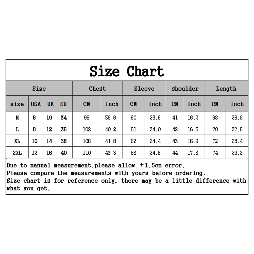 [Наш Размер 2XL] Обхват груди: 110 см/43,3 дюйма, длина рукава: 63 см/24,8 дюйма, длина: 74 см/29,2 дюйма, ширина плеч: 44 см/17,3 дюйма (приблизительно)