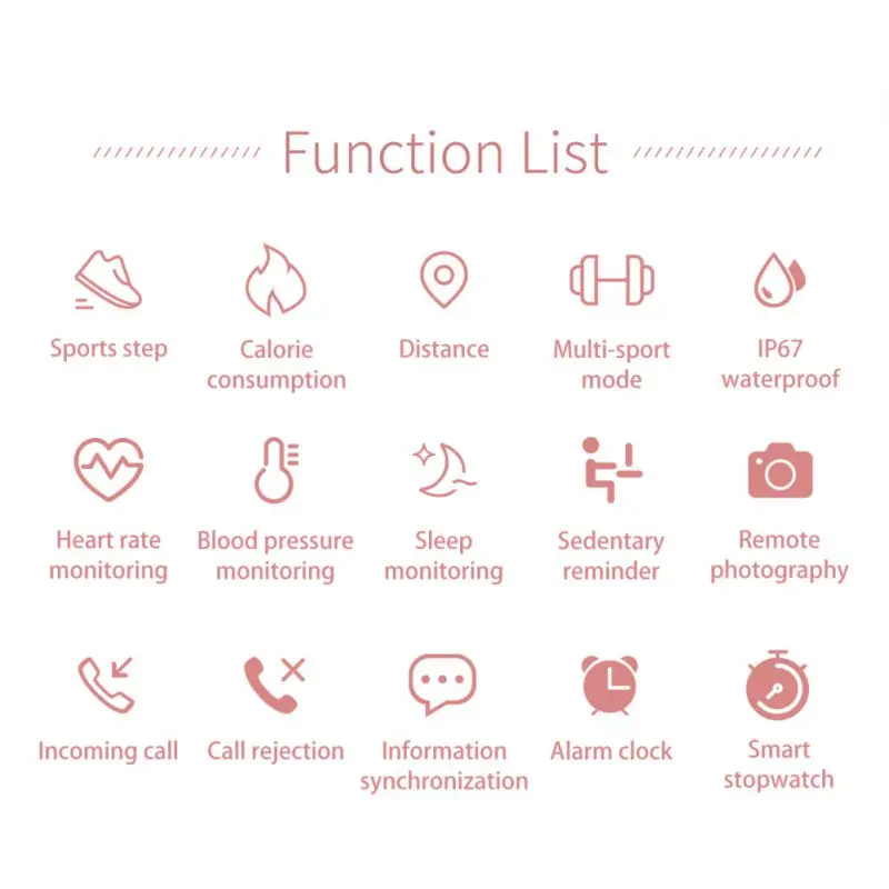 6. Другие функции включают время, шагомер, с вибрационным напоминанием, будильник, секундомер, женские функции, напоминание о сидячем положении и фотосъемку Bluetooth