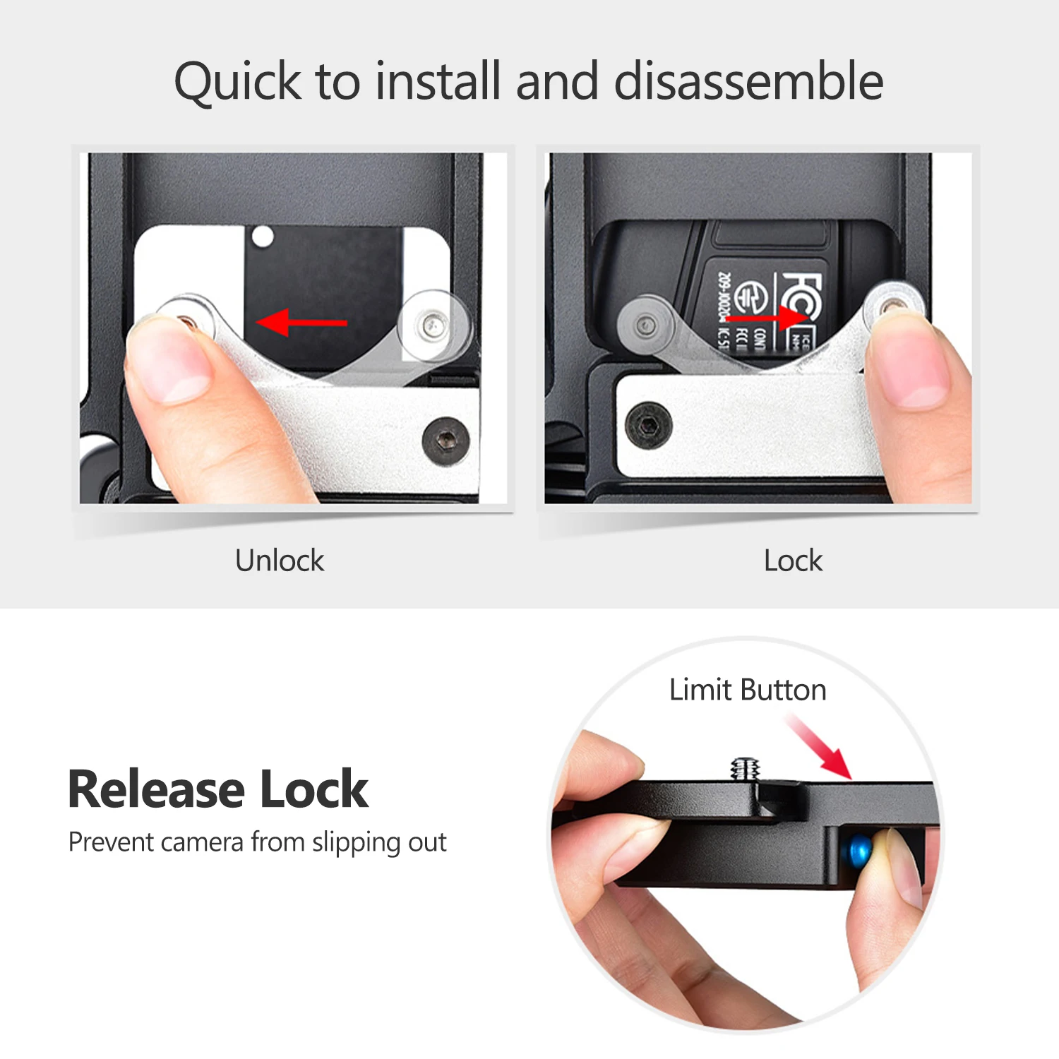 Клетка и ручка оснащены винтовыми отверстиями 1/4 дюйма и 3/8 дюйма, крепление для холодной обуви для расширения аксессуаров для фотографии, таких как монитор, микрофон, светодиодная лампа и другие аксессуары. Контакты ARRI locking позволяют прикрепить больше аксессуаров.