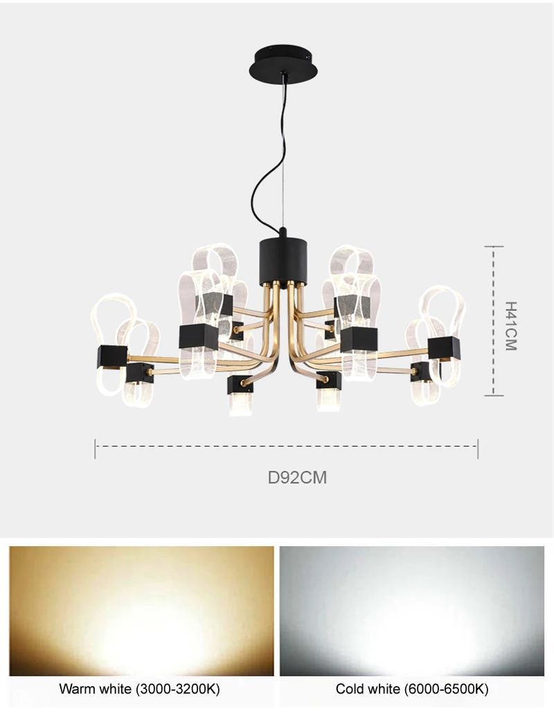 Технические характеристики: Название продукта: люстра Подвесная лампа Материал: железо + акрил Цвет абажура: золотой + черный Абажур Цвет: прозрачный Головки: 6/8/8 + 4 головки Светильник источник света: светодиодный светильник s Светильник Цвет: теплый белый свет, холодный белый свет Мощность: 6 головок 60 Вт, 8 головок 80 Вт, 8 + 4 головки 120 Вт Напряжение: AC100-240V 50/60Hz Отделка: покраска Размер: Dia92 * h41 см Площадь освещения: 10-15 квадратных метров Аппликаторы: гостиная, спальня, кабинет, магазин, выставочный зал, зал и т. Д. Примечание: размер упаковки и вес 6/8/12 головок отличаются друг от друга, таким образом, Ваша посылка будет доставка по EMS/DHL/UPS/Fedex/TNT или служба special line, в случайном порядке.